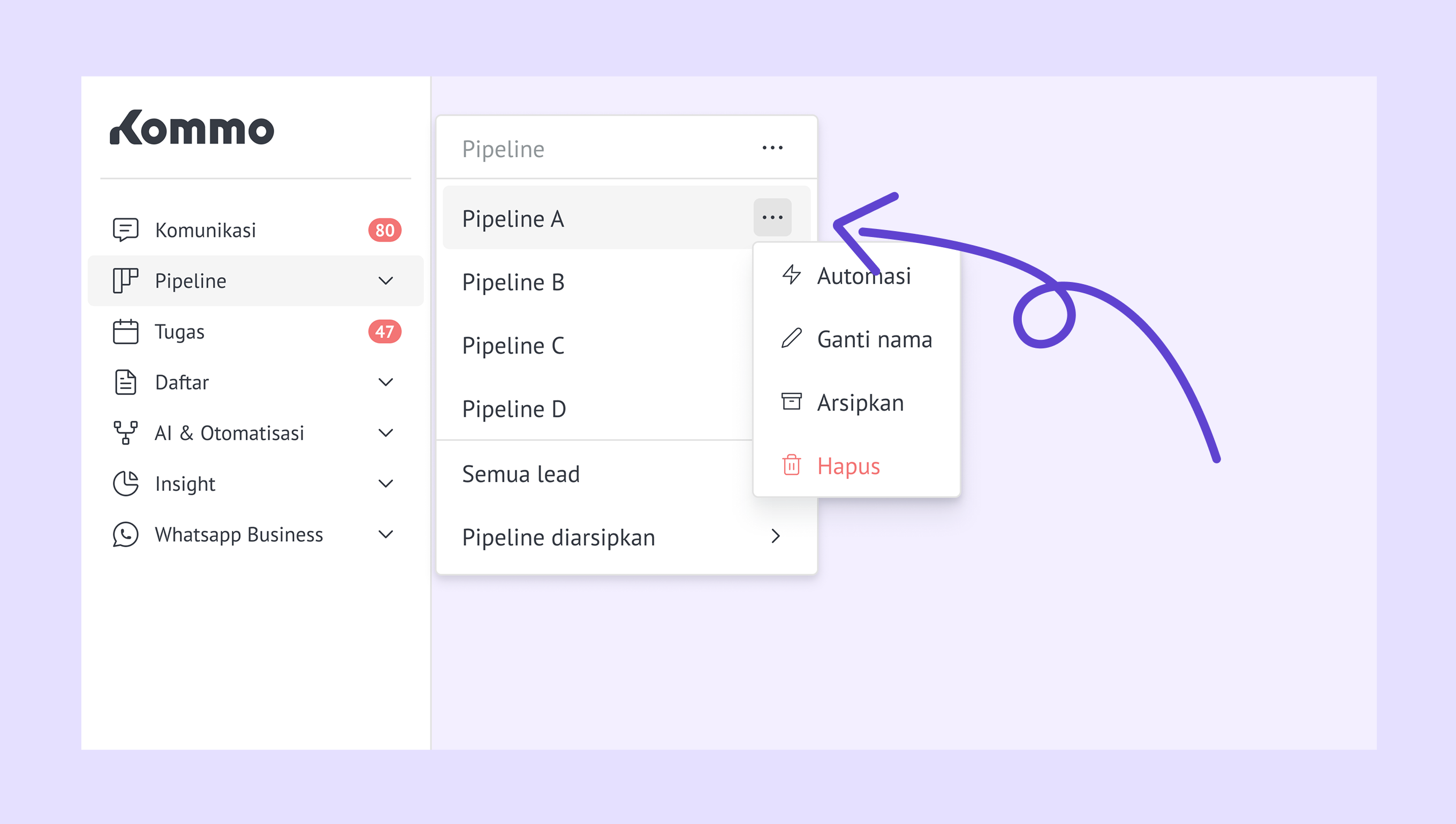 Kelola pipeline – arahkan kursor ke nama pipeline lalu buka menu … untuk mengotomatisasi, mengganti nama, mengarsipkan, atau menghapusnya.