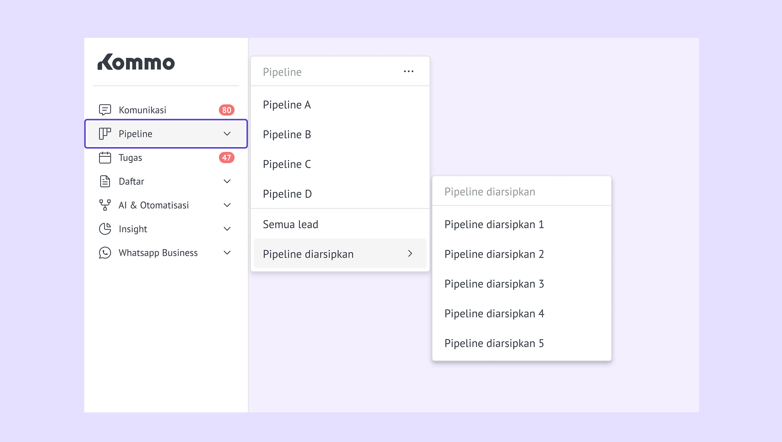 Semua lead & arsip – lihat semua lead di berbagai pipeline melalui Semua lead , atau cek transaksi lama di Pipeline diarsipkan .