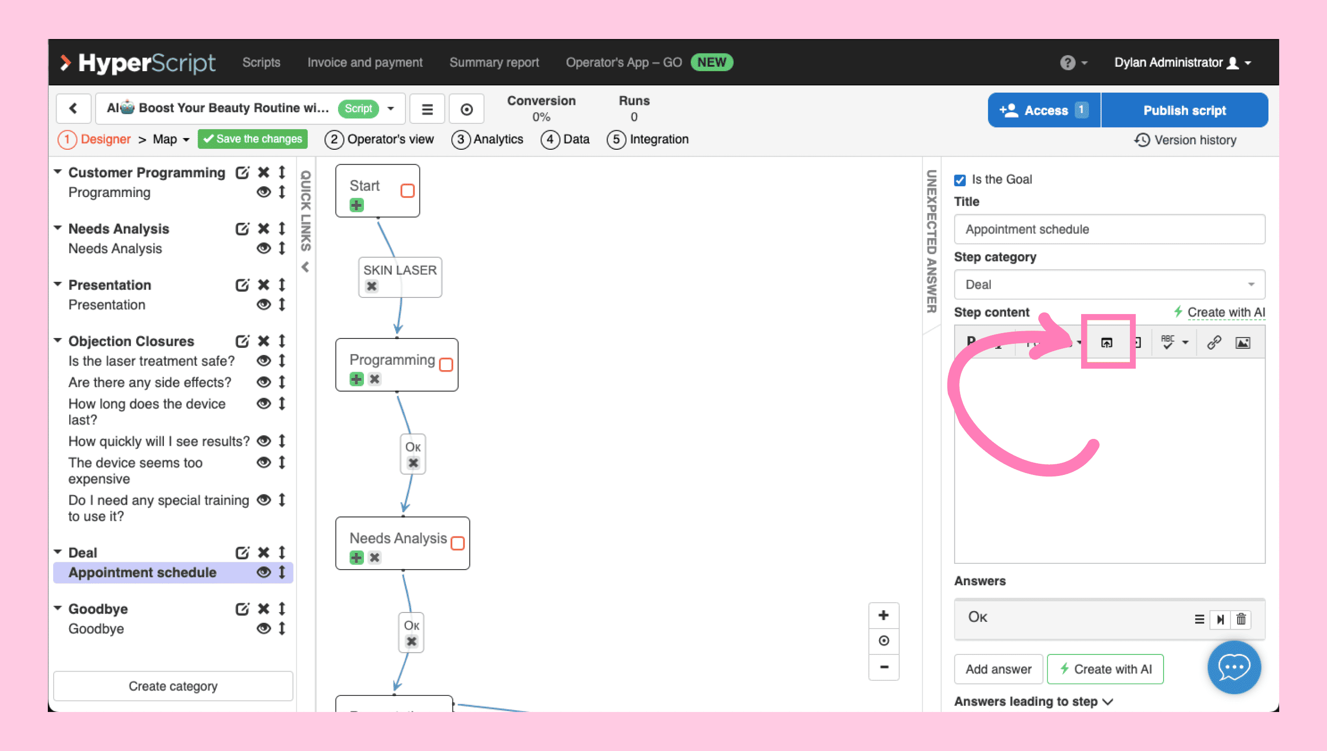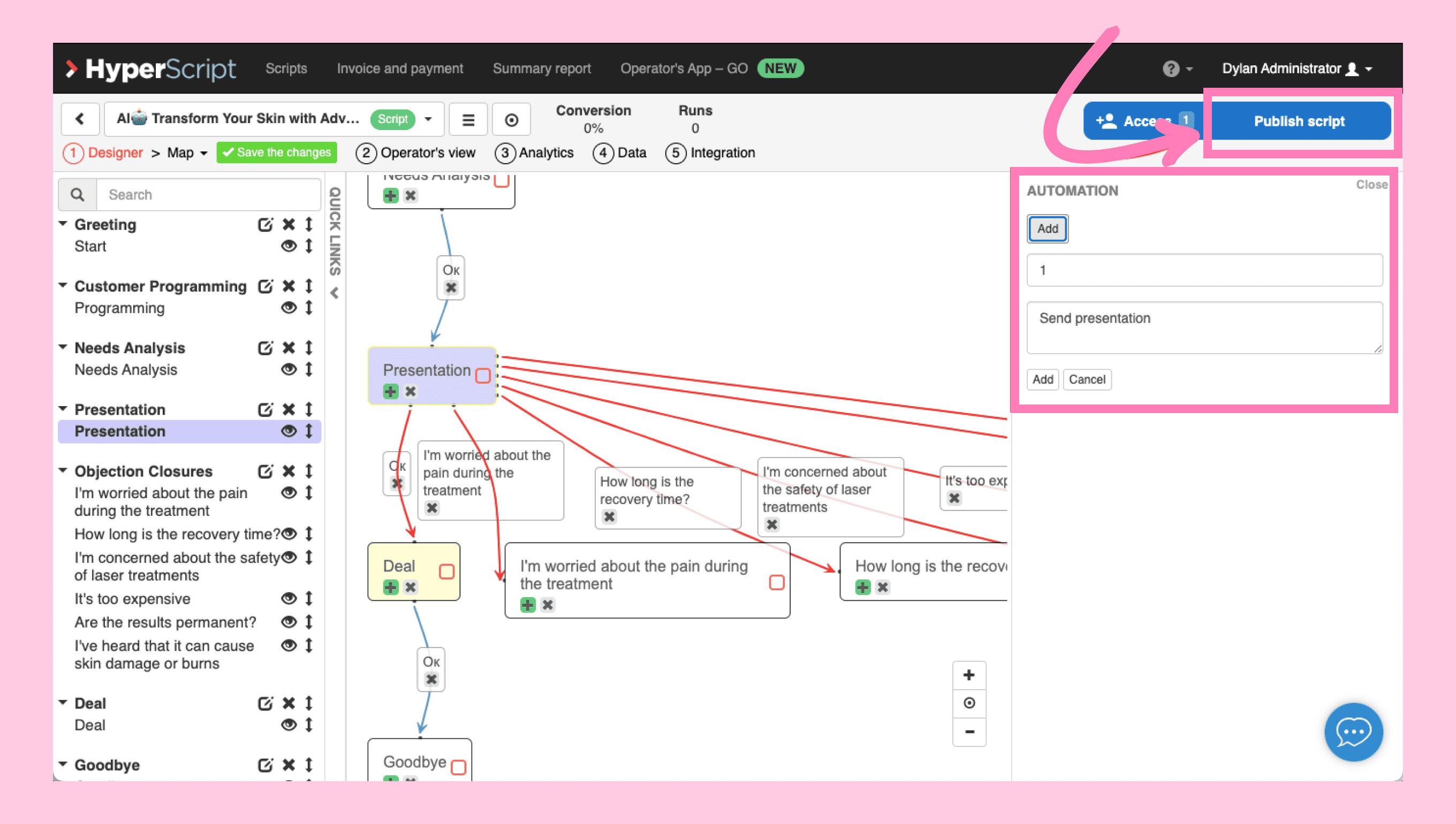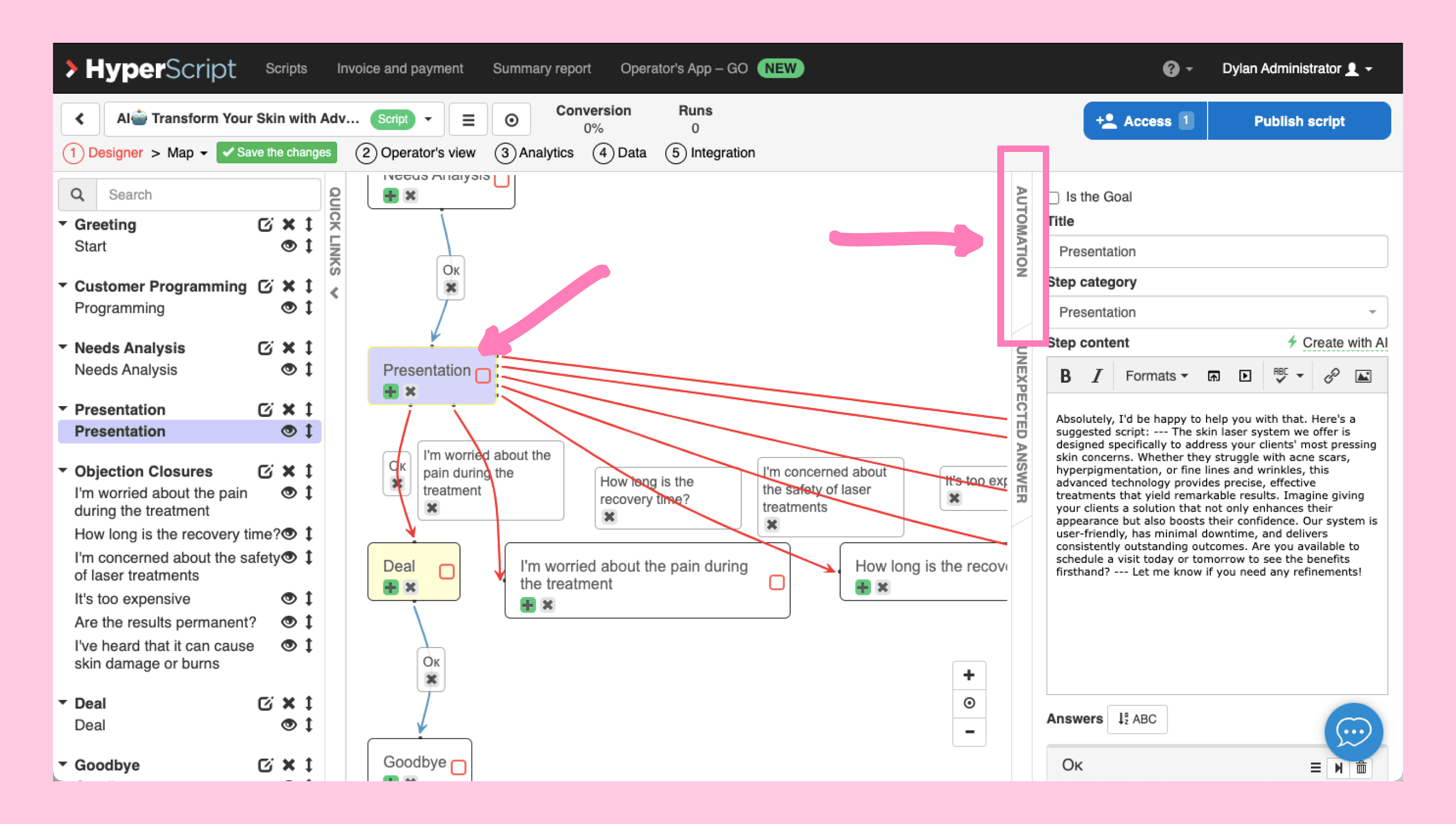 Buka skrip kamu di HyperScript. Pilih step setelah tindakan yang harus membuat tugas (misalnya “send presentation to the client”). Klik Automation.