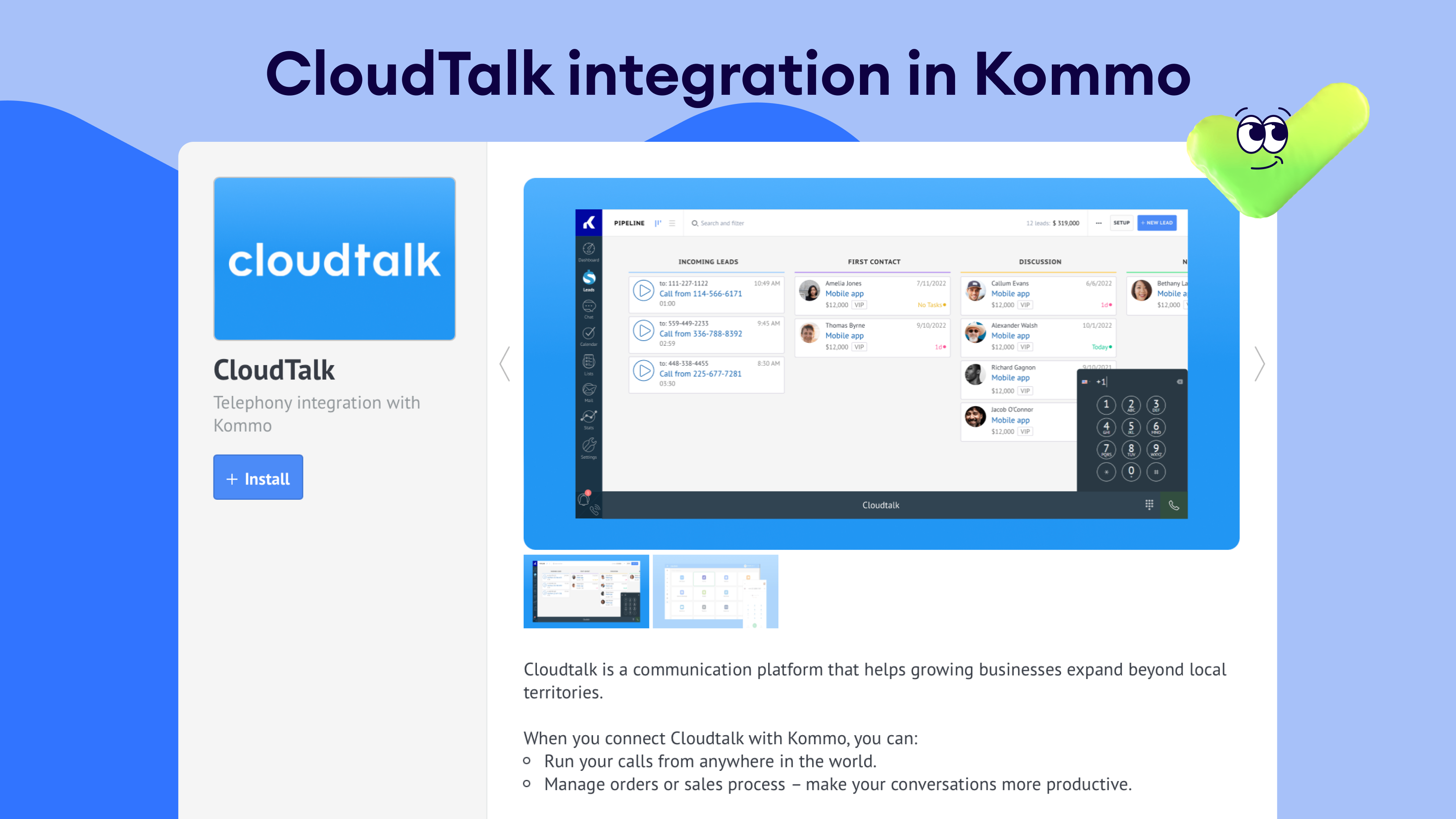 The CloudTalk integration in Kommo transforms your CRM into a comprehensive calling solution. By connecting CloudTalk, you can make and receive calls directly from lead cards, log all call activities, and automate call-related workflows. This integration streamlines your communication processes, ensuring that every call is efficiently managed and tracked within your CRM.