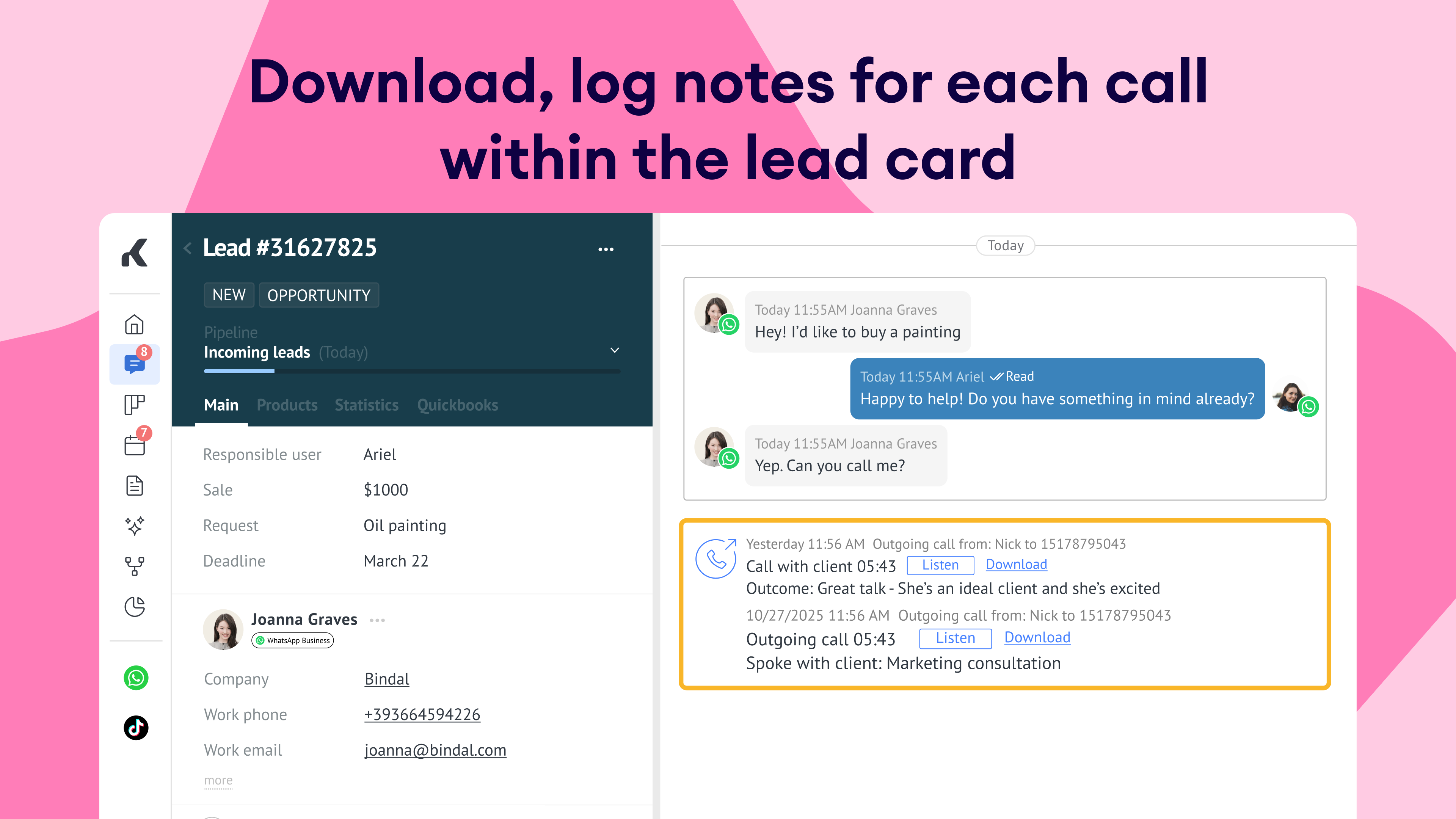 Automatic call logging: Keep a complete record of call details, including duration and outcome, within each lead card.