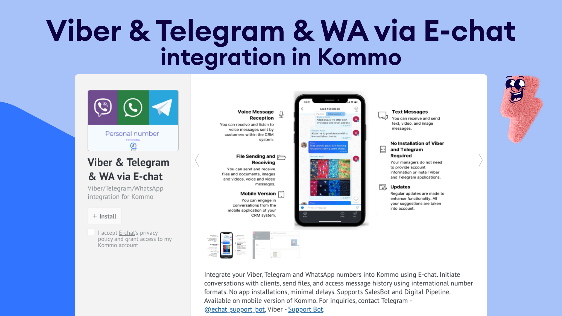 The Viber, Telegram & WhatsApp via E-chat integration in Kommo brings all your messenger communication directly into your CRM. By connecting real personal numbers from WhatsApp, Viber, and Telegram, you can chat with leads from a single interface, automate follow-ups, and keep your entire sales process connected. No switching apps, just fast, unified messaging that works.