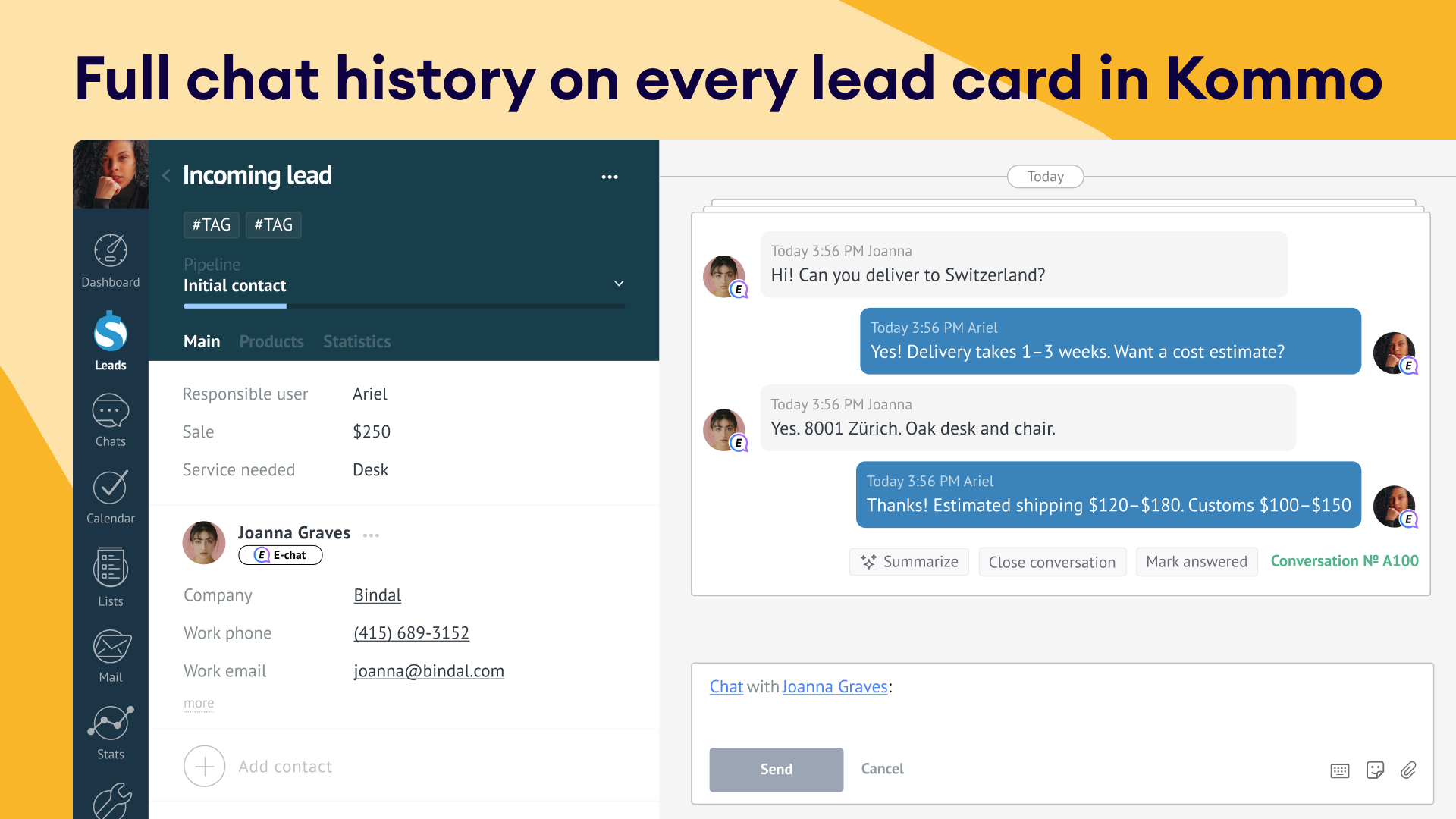 Because it brings E-chat conversations directly into Kommo, where the sales magic happens, messages from WhatsApp, Viber, and Telegram turn into structured, trackable conversations linked to each lead. It’s a natural, integrated way to stay connected and move leads forward in the sales process without switching tools or tabs.