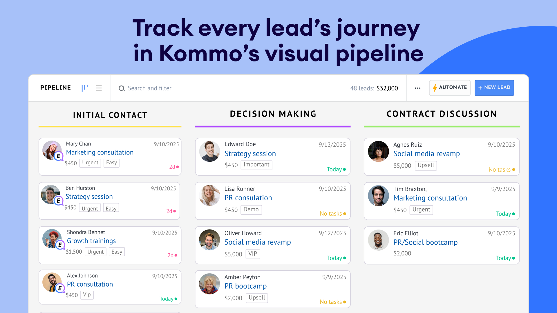 Salesbot automation: Use Kommo’s Salesbot to auto-reply, follow up, or move leads forward in your sales pipeline. No coding skills required to set up your bots in Kommo.