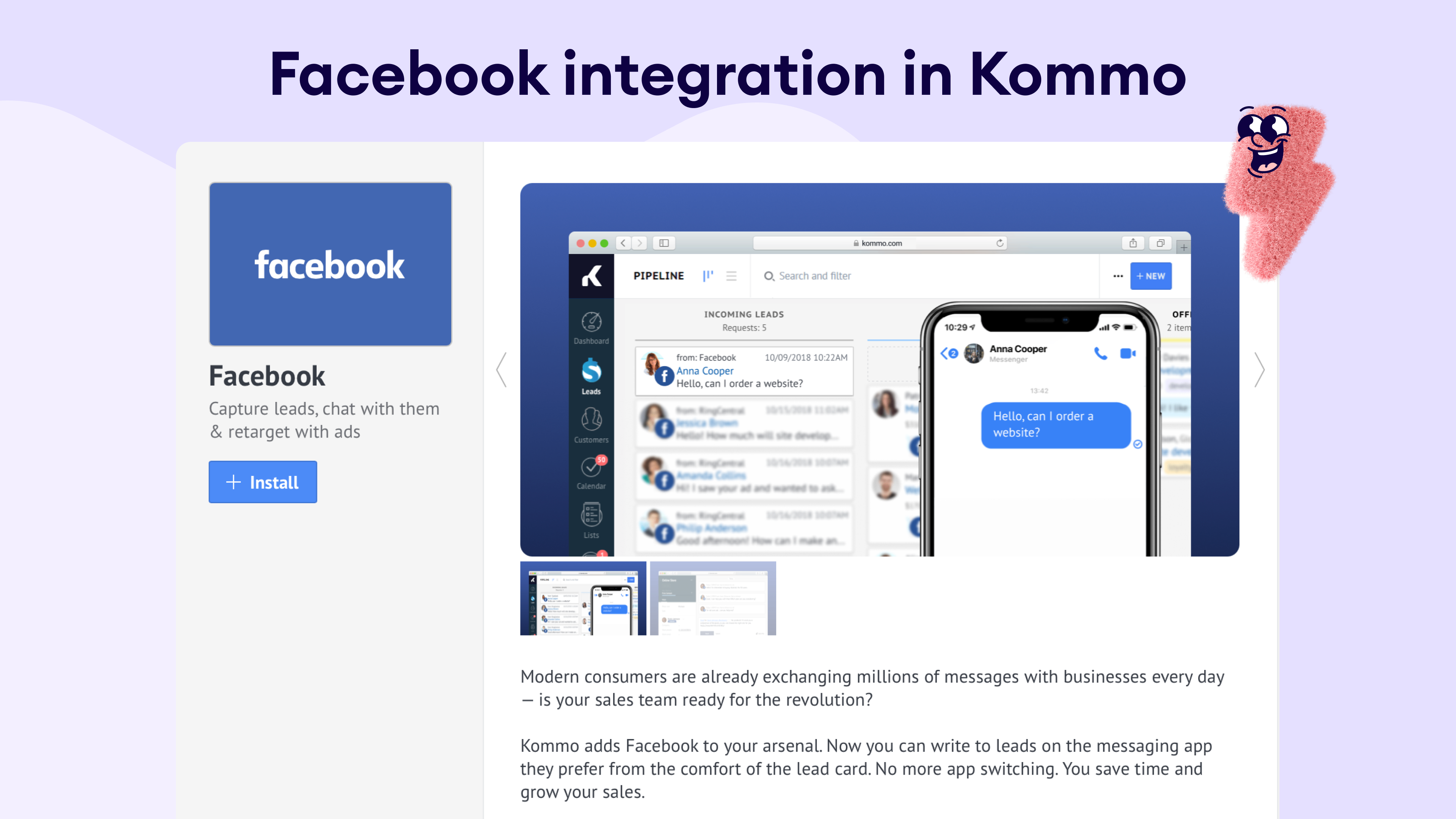 The Facebook Ads integration gives Kommo users a powerful way to run timely, hyper-targeted campaigns directly tied to their pipeline activity. When paired with Kommo’s visual pipelines, multichannel inbox, and sales automation via Salesbot, it becomes a unified system that drives engagement from ad click to closed sale - while delivering clear ROI.
