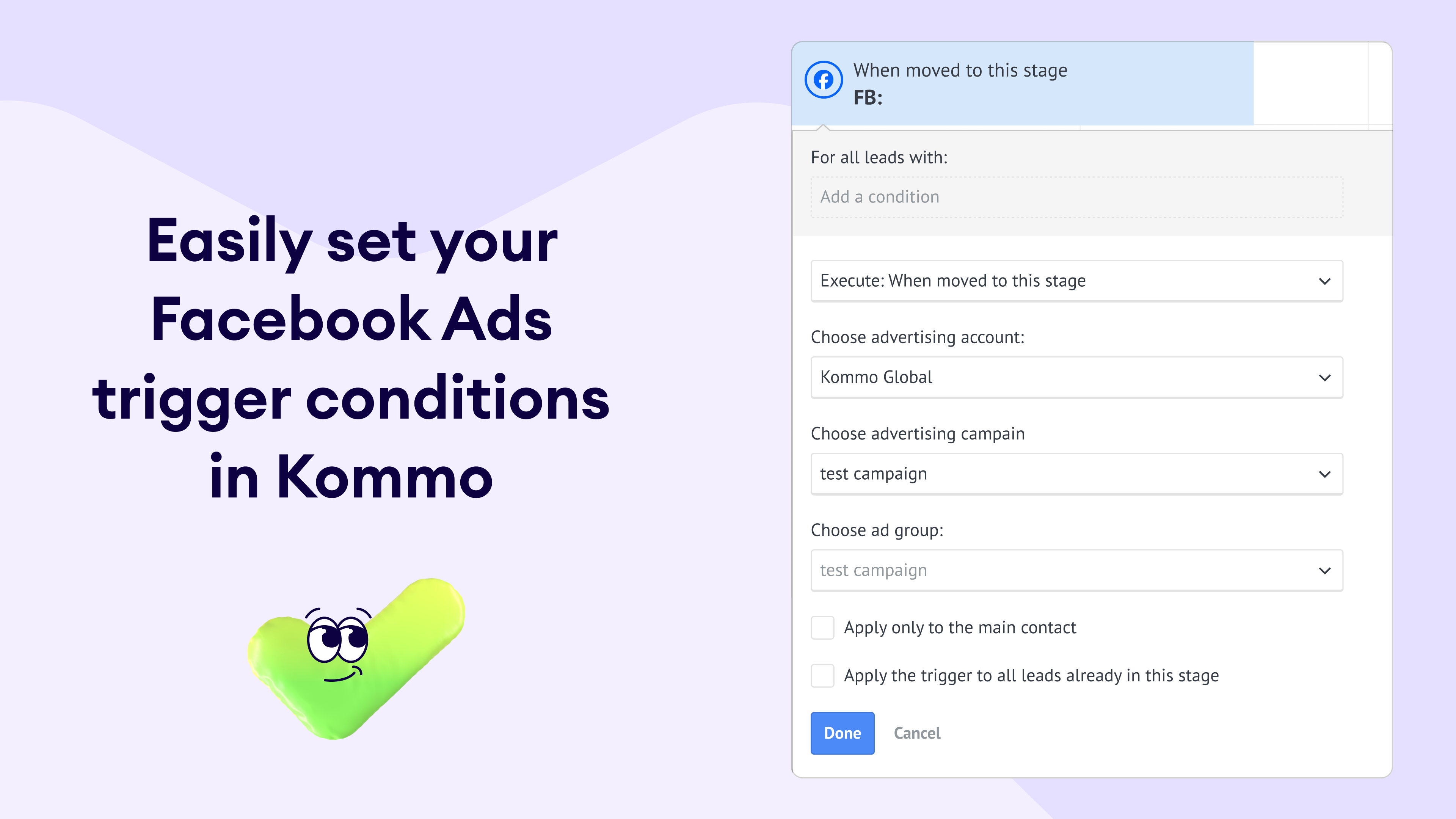 Custom audience sync: Build custom Facebook audiences directly from Kommo triggers as leads move through your pipeline.