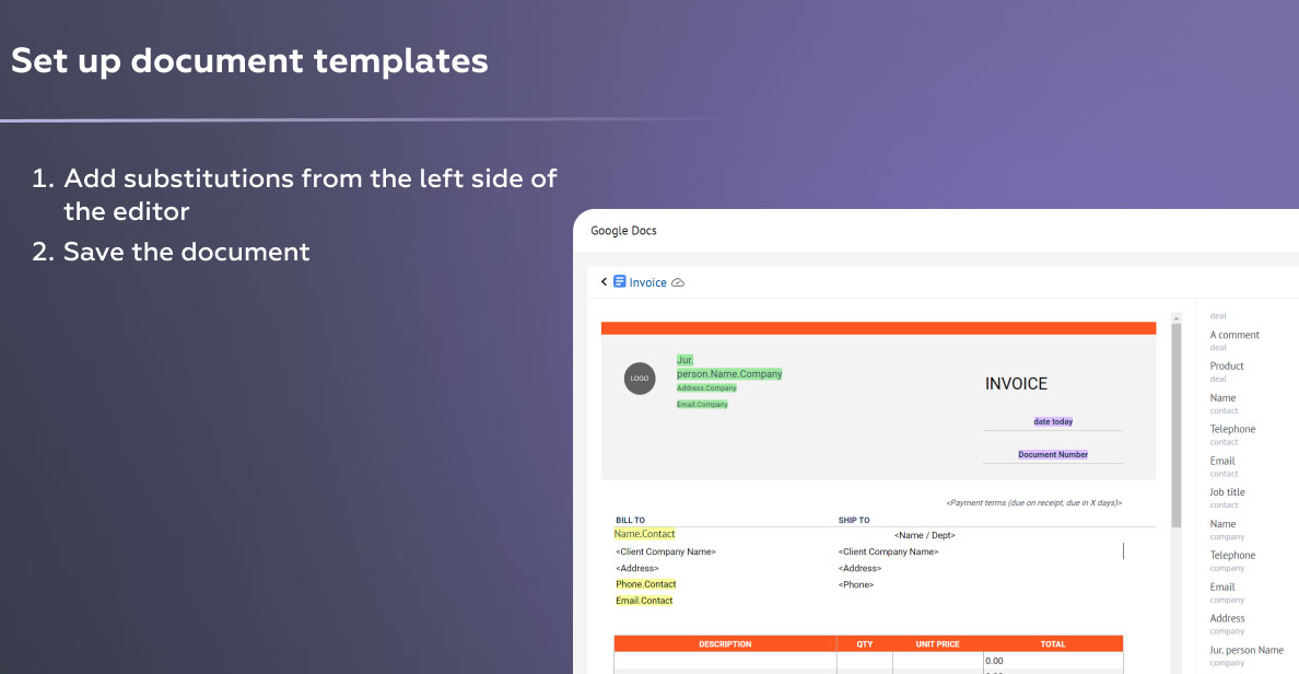 Using the Google Documents widget with Kommo lets you create template documents directly from leads. You can add variables in the template editor to include data from any Kommo fields in your documents.