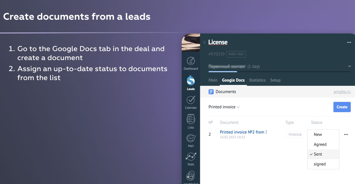 With the Google Documents widget, you can create your own template documents from leads in Kommo. By integrating Google Documents by amgroup with Kommo, you get several useful features: