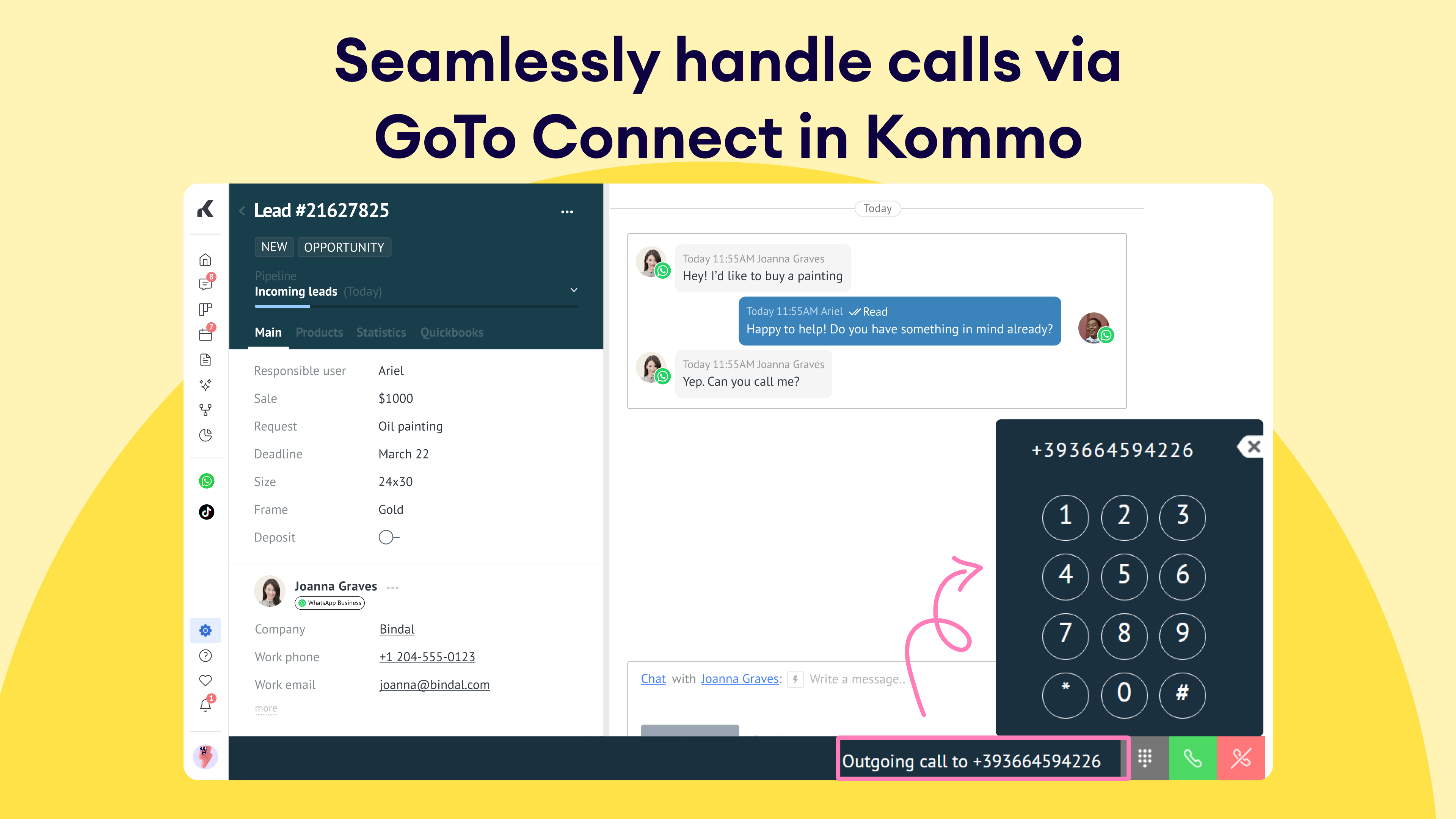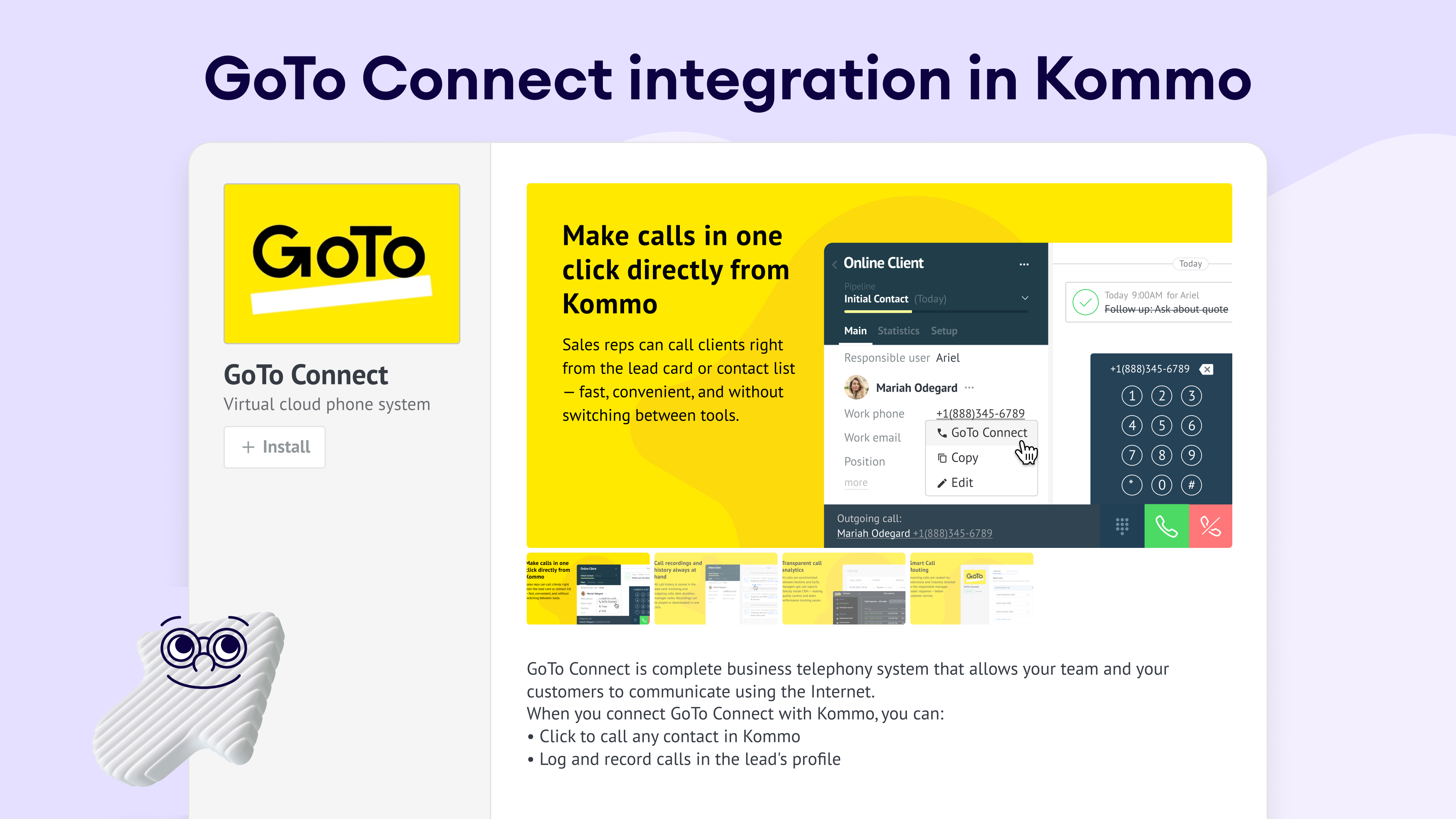 Kommo clients use GoTo Connect because it eliminates the busywork of making calls. One-click dialing replaces manual entry of numbers, call logs appear automatically, and reminders handle follow-ups. Add in seamless call routing, and teams save hours while delivering a smoother customer experience.