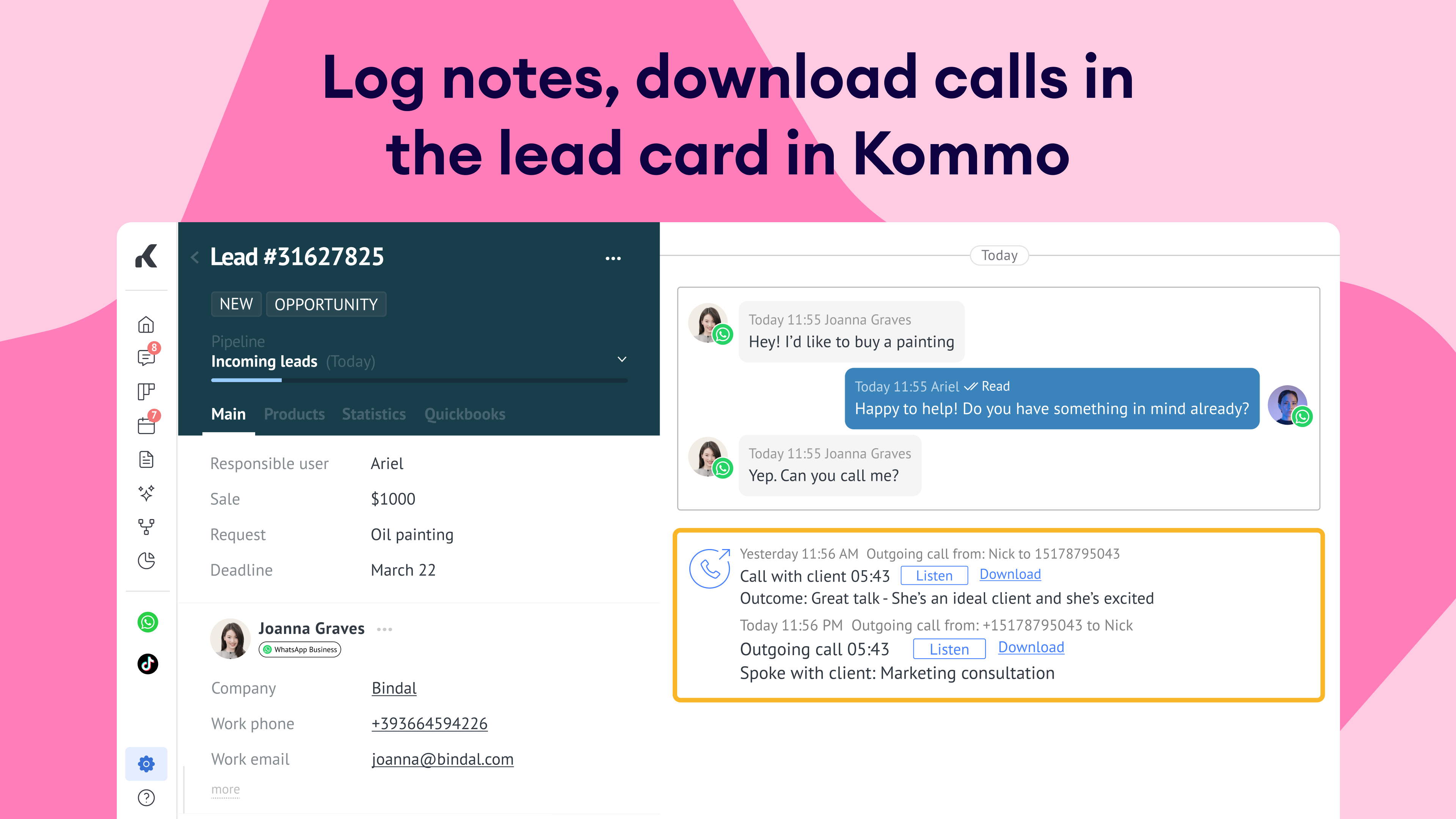 Automatic call logging: Keep a complete record of call details, including duration and outcome, within each lead card.