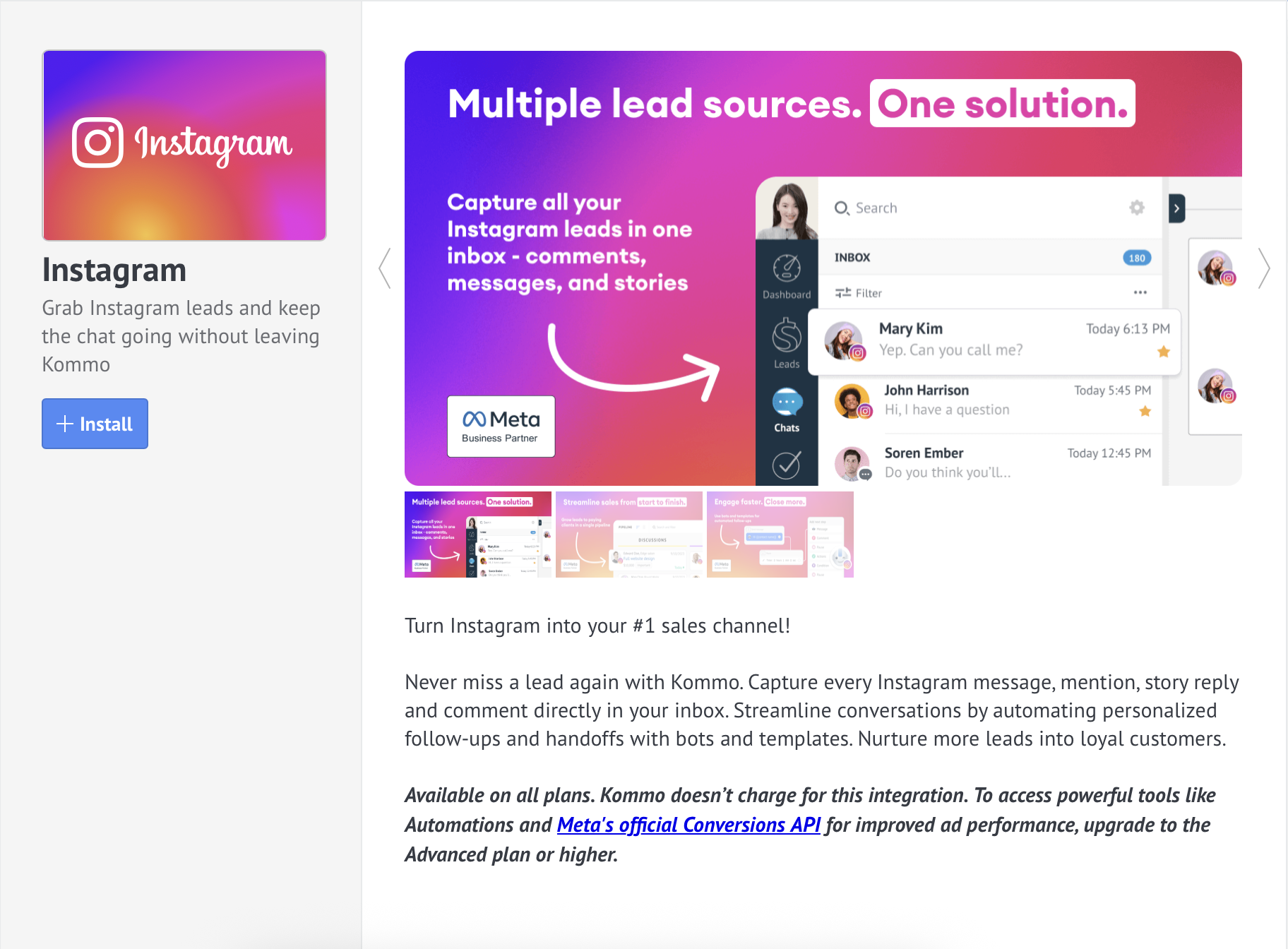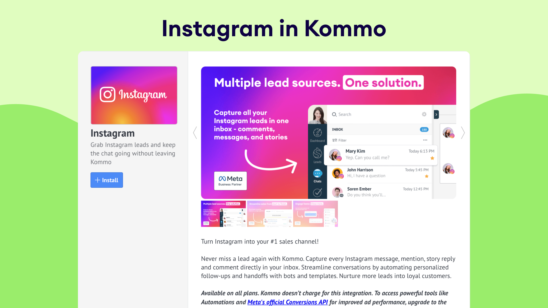 The Instagram integration gives Kommo users a seamless way to turn social engagement into sales. Paired with Kommo’s visual pipelines, multichannel inbox, Salesbot automation, and AI-assisted replies, you get a fully connected system that captures details, assigns next steps, and nudges every opportunity forward—without lifting a finger.