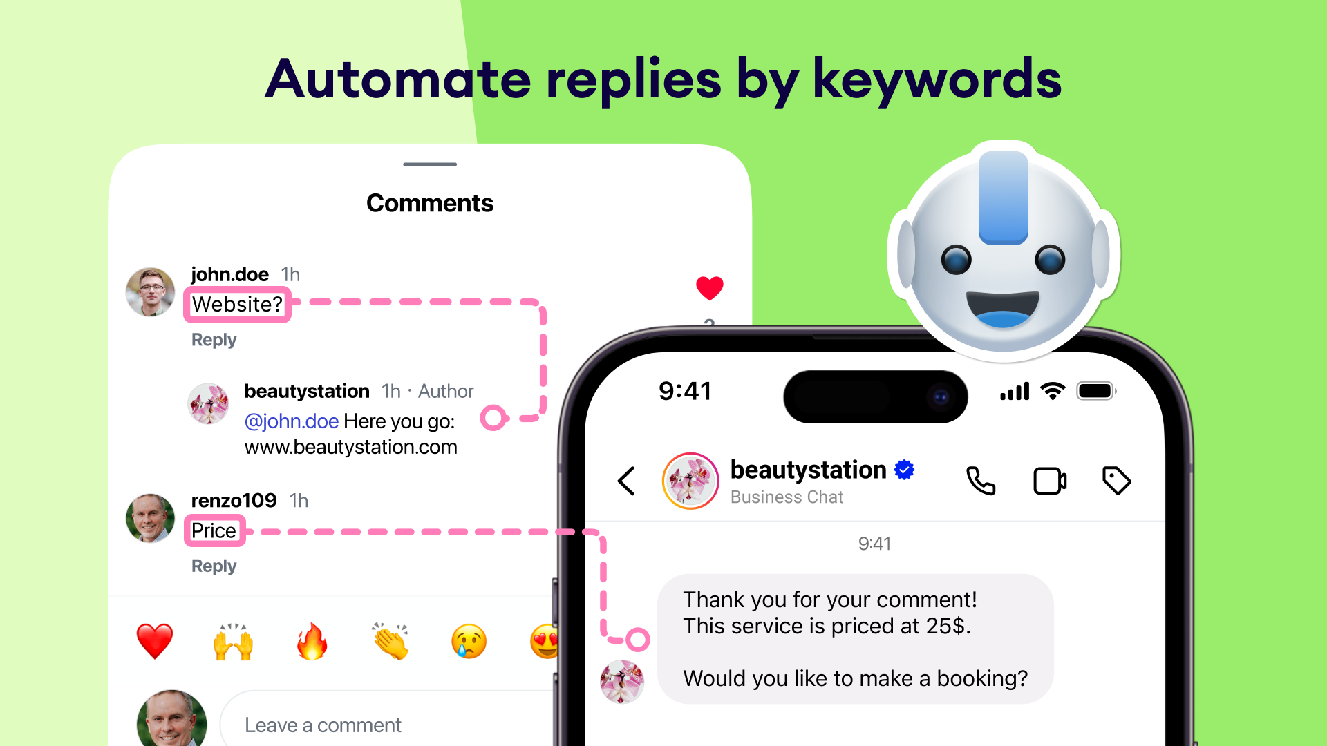 Keyword routing: Auto-reply in comments or send a DM based on detected keywords (e.g., “book,” “website”).
