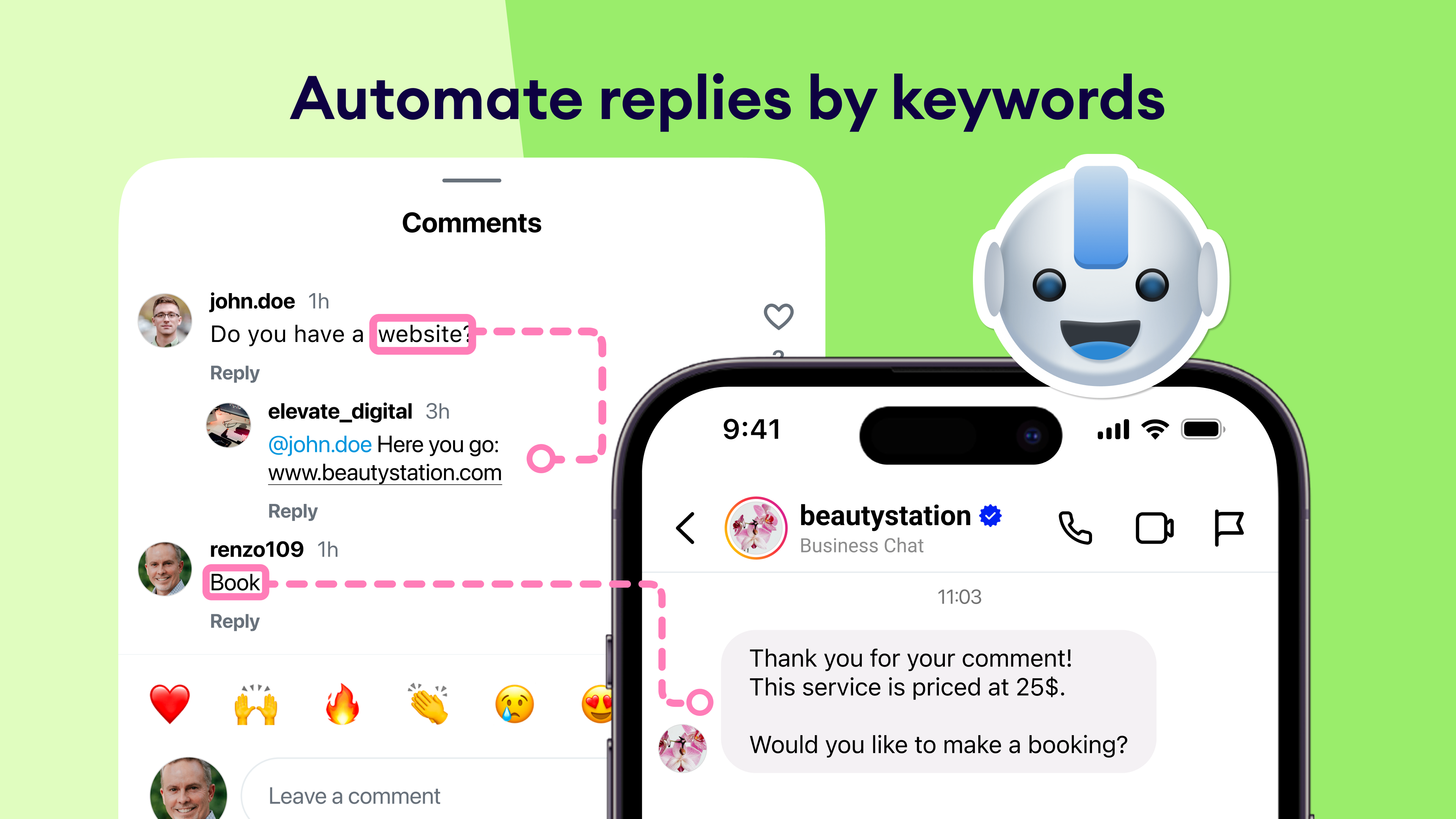 Keyword routing: Auto-reply in comments or send a DM based on detected keywords (e.g., “book,” “website”).