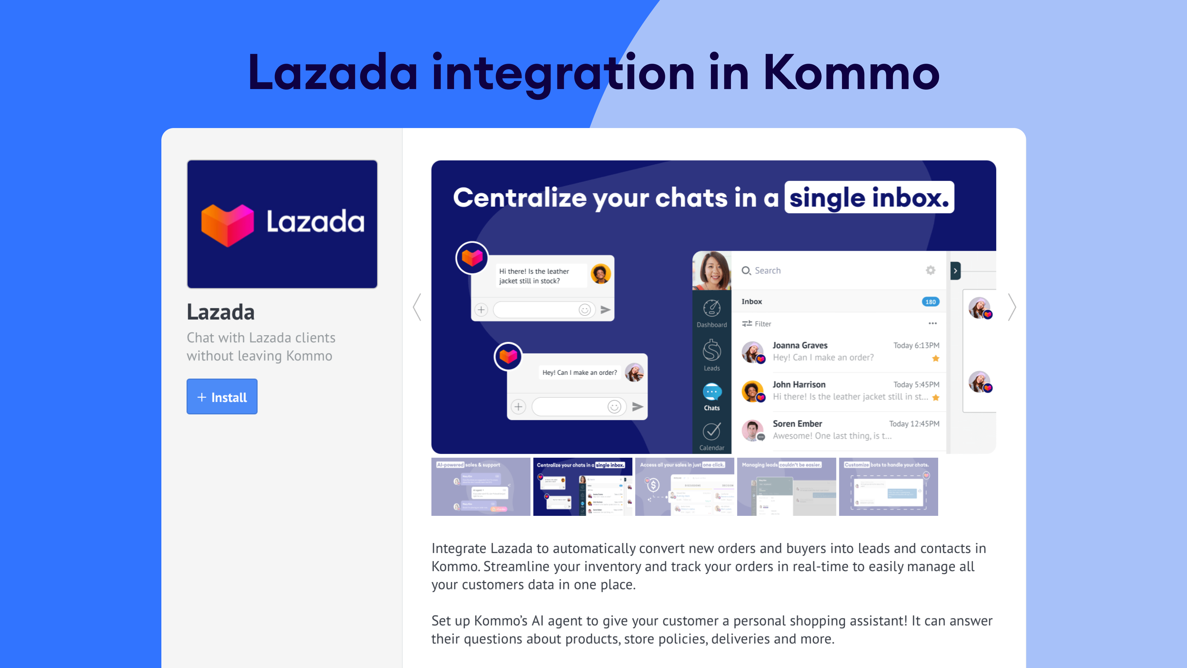 In Kommo, go to Settings > Integrations > Lazada and click Install.