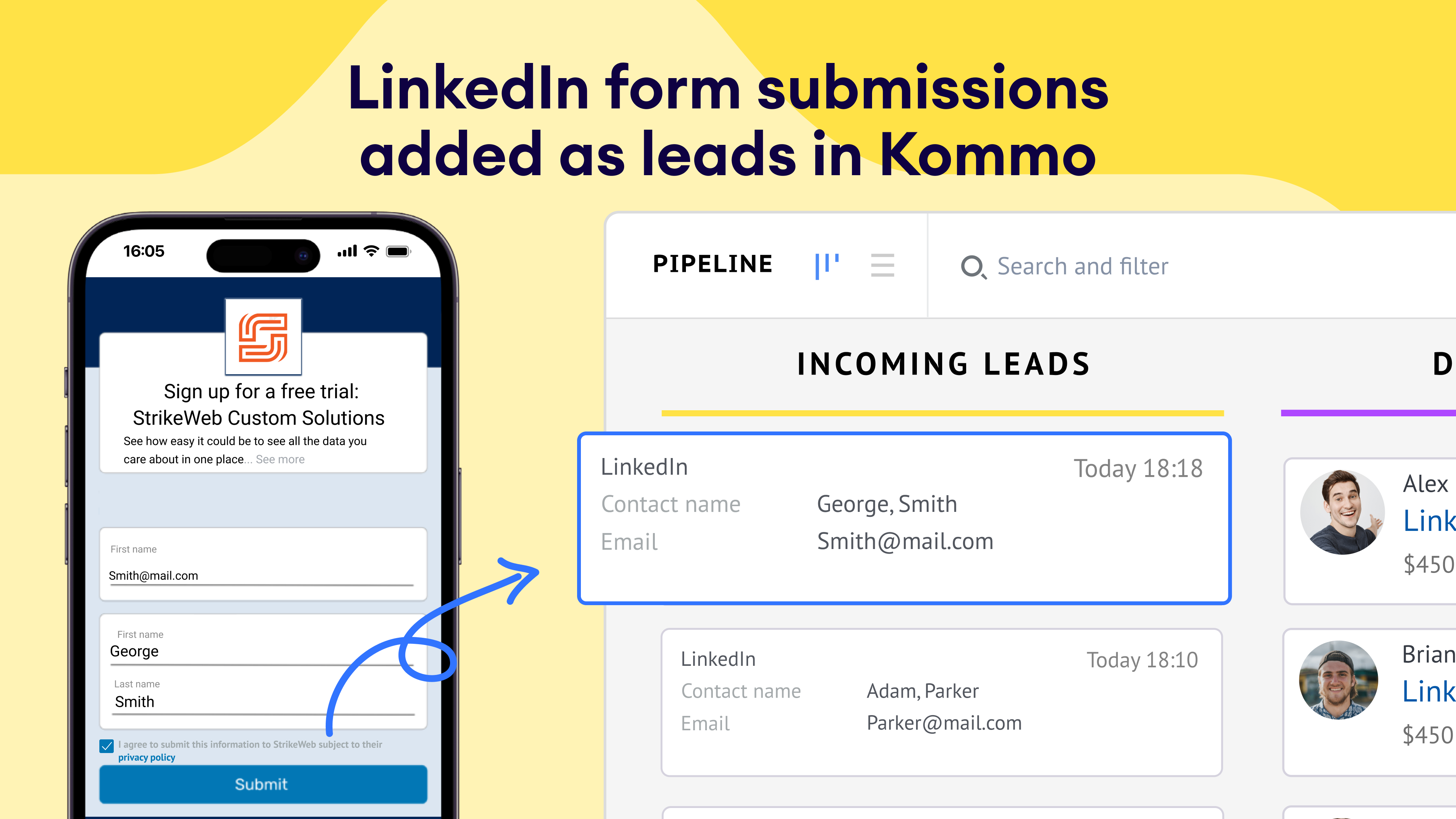 The LinkedIn integration gives Kommo users a fast, reliable way to turn profile visits and Lead Gen Form submissions into qualified leads. Paired with Kommo’s visual pipelines, multichannel CRM, and workflow automation, you get a connected system that routes, assigns, and follows up automatically, so every new contact becomes a tracked opportunity.