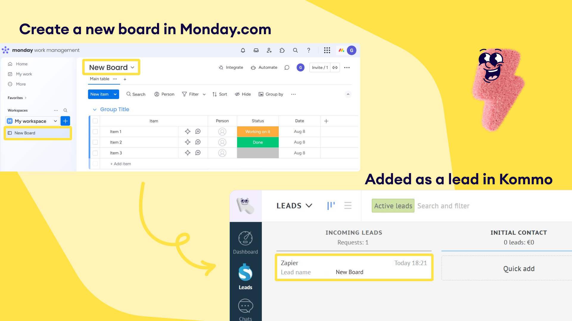 - Real-time progress syncing: Sync lead status changes from Kommo to Monday, giving teams visibility into what’s next.
