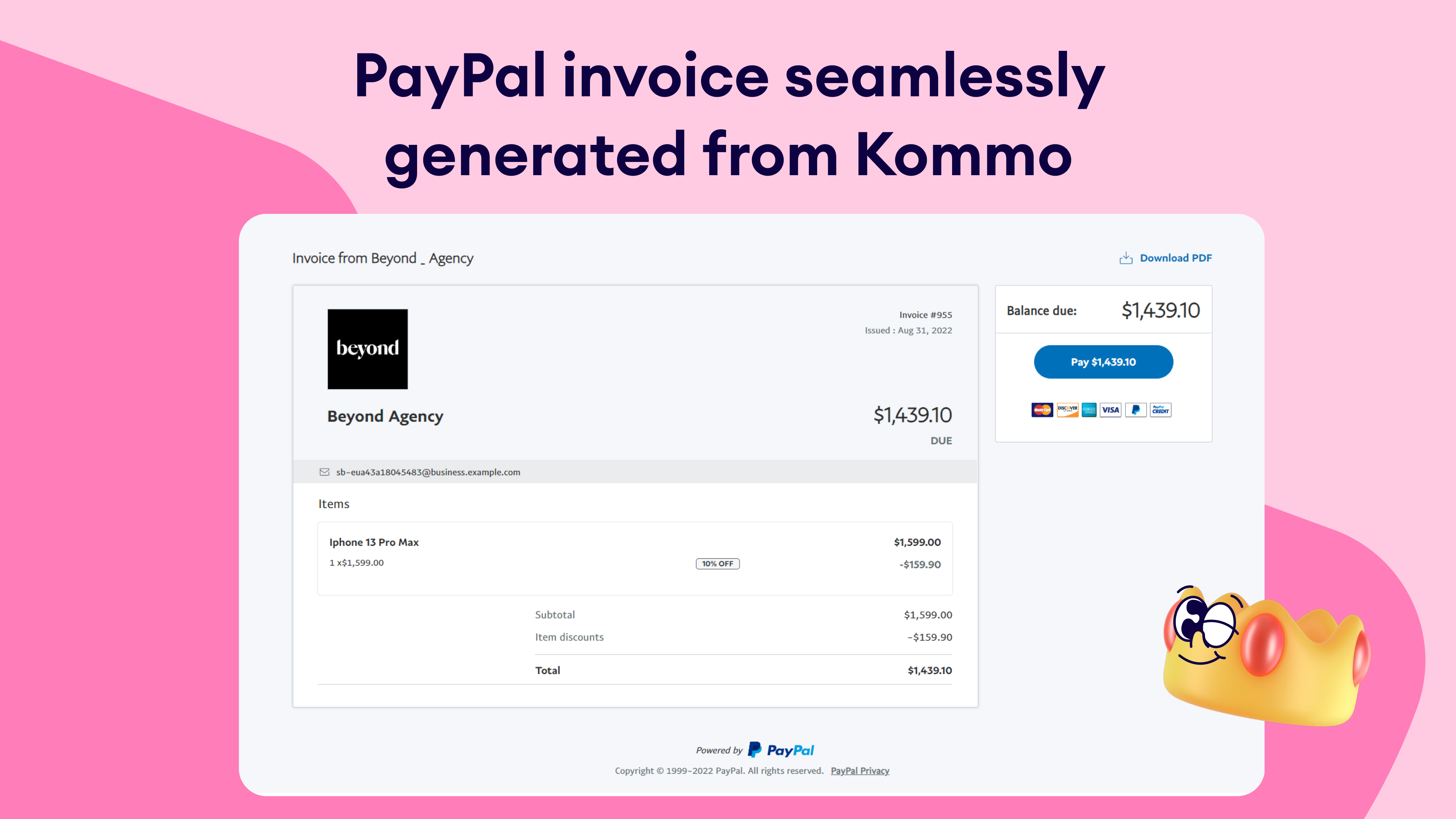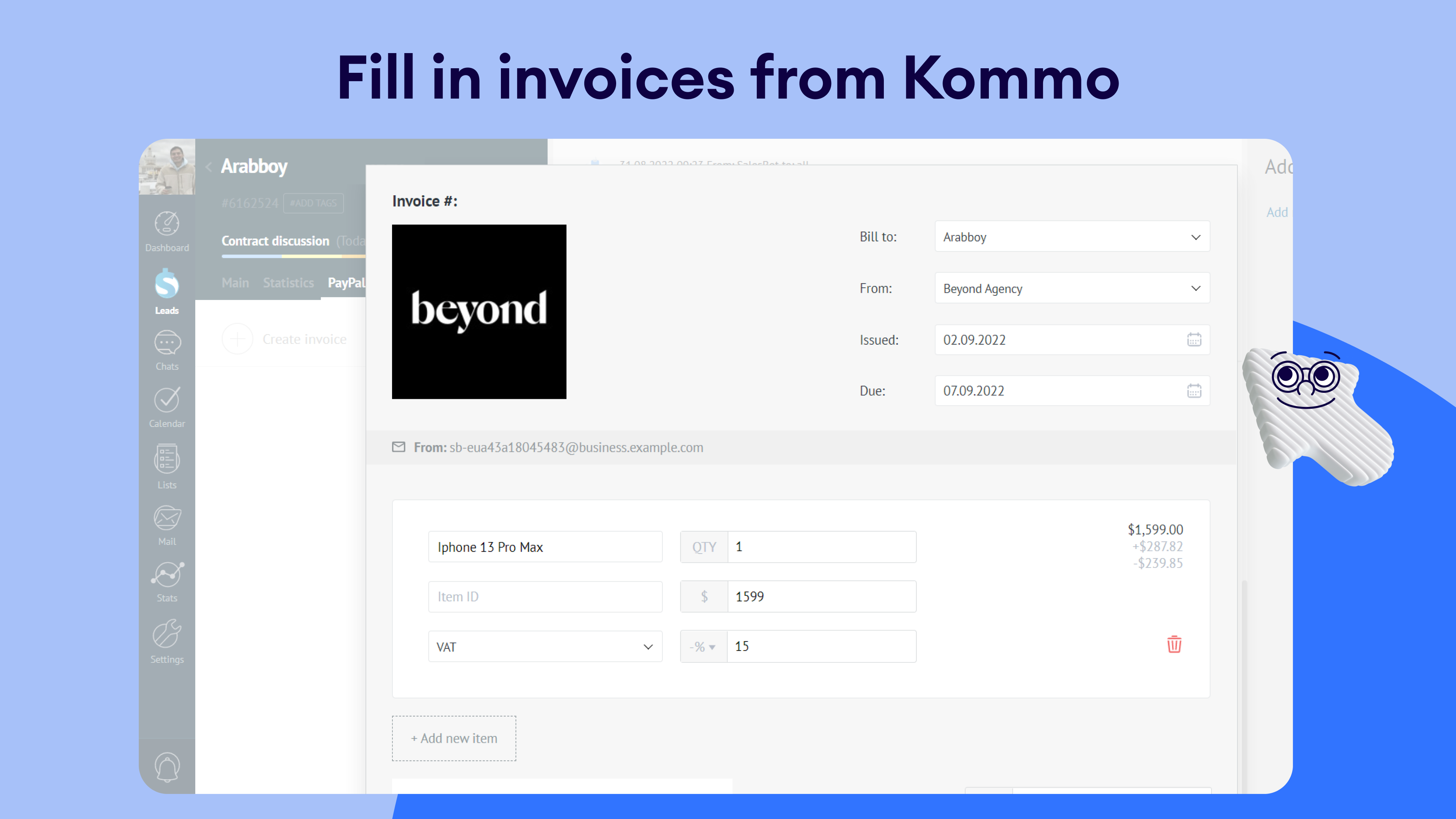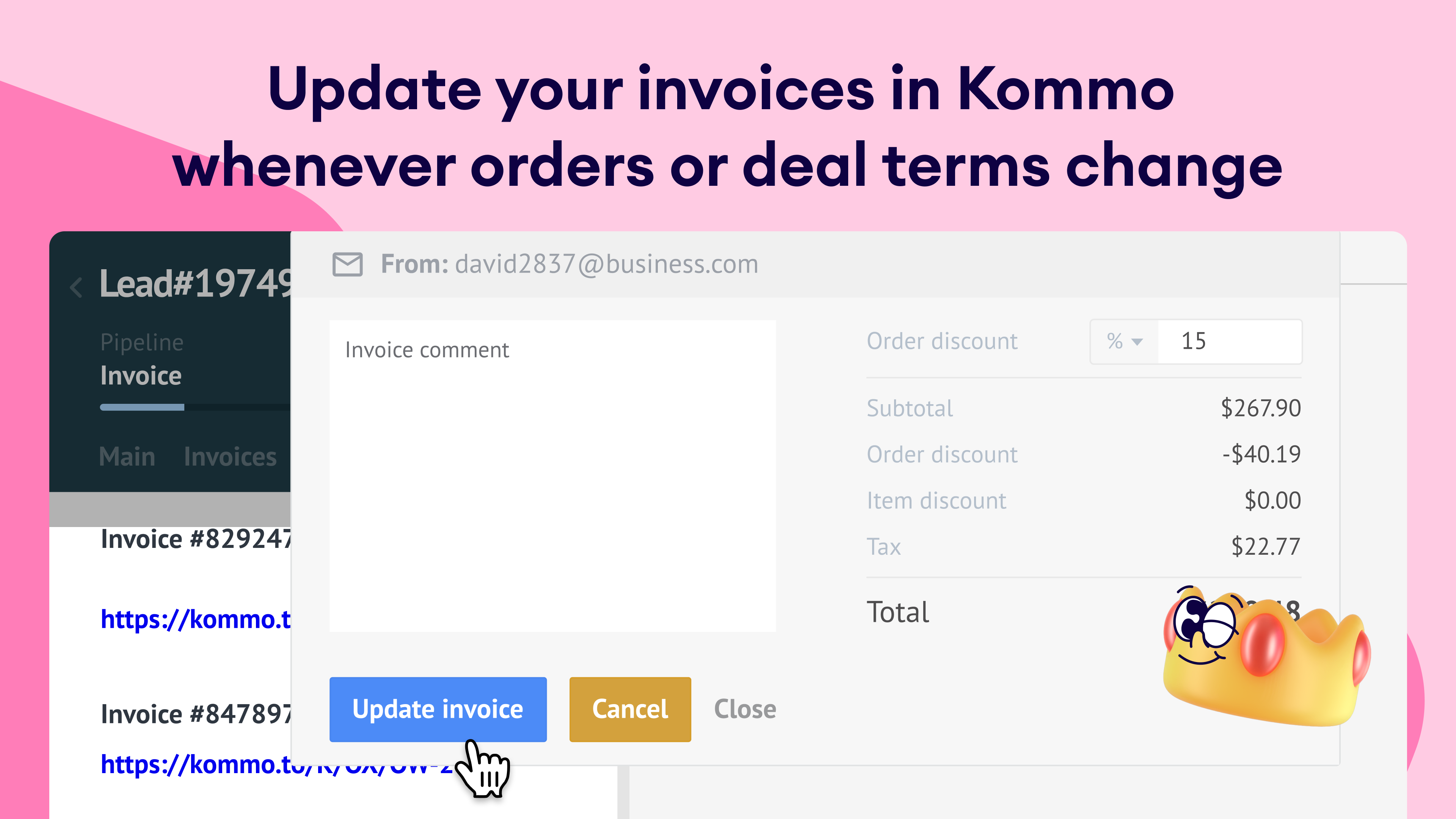 Invoice management: Edit, cancel, or resend unpaid invoices directly from Kommo. Keep all billing information organized, accurate, and accessible without juggling multiple platforms.