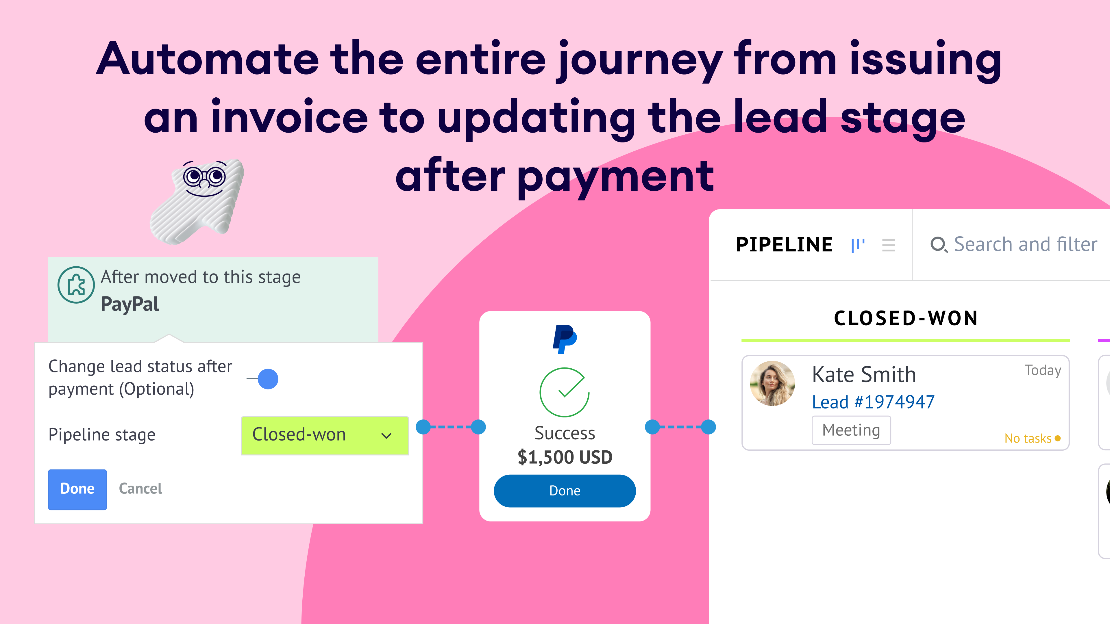 Pipeline automation: Streamline your sales process by automatically moving leads to the next stage once payment is received. This ensures your pipeline reflects actual revenue progress in real time.