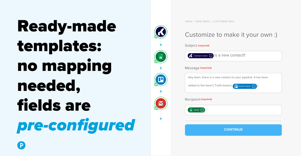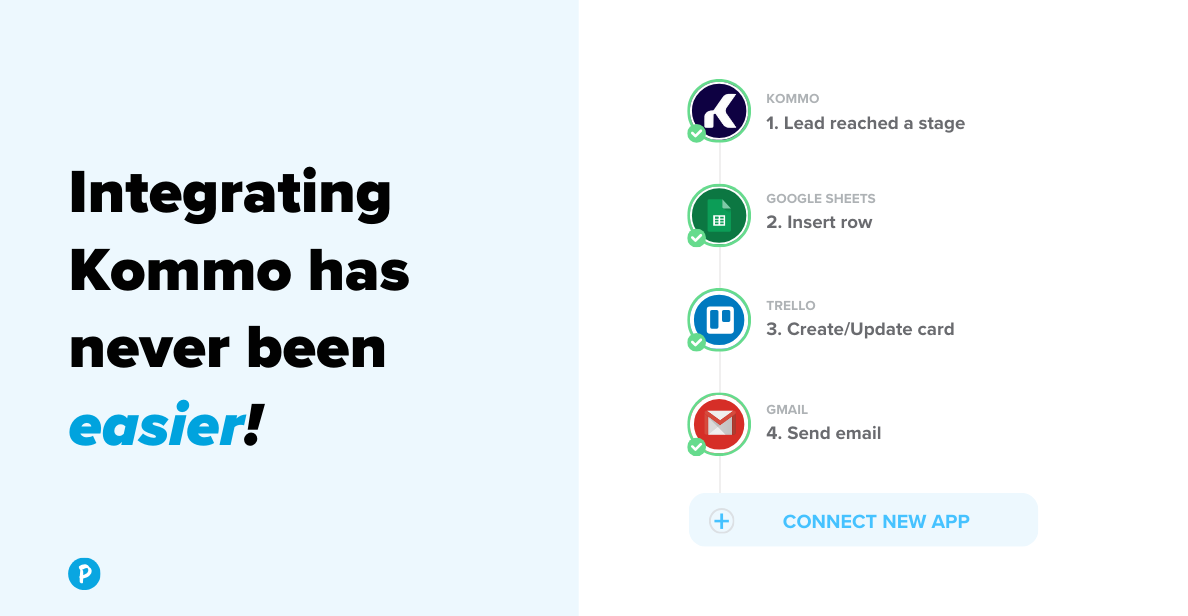 Pluga makes it easy to integrate your favorite apps with Kommo using a completely no-code builder. You can create multi-app workflows that automate all the repetitive tasks in your workday, boosting productivity and freeing you up to focus on what matters most. With flexible triggers, advanced filters, and ready-made templates, Pluga helps you get more from Kommo without the hassle.