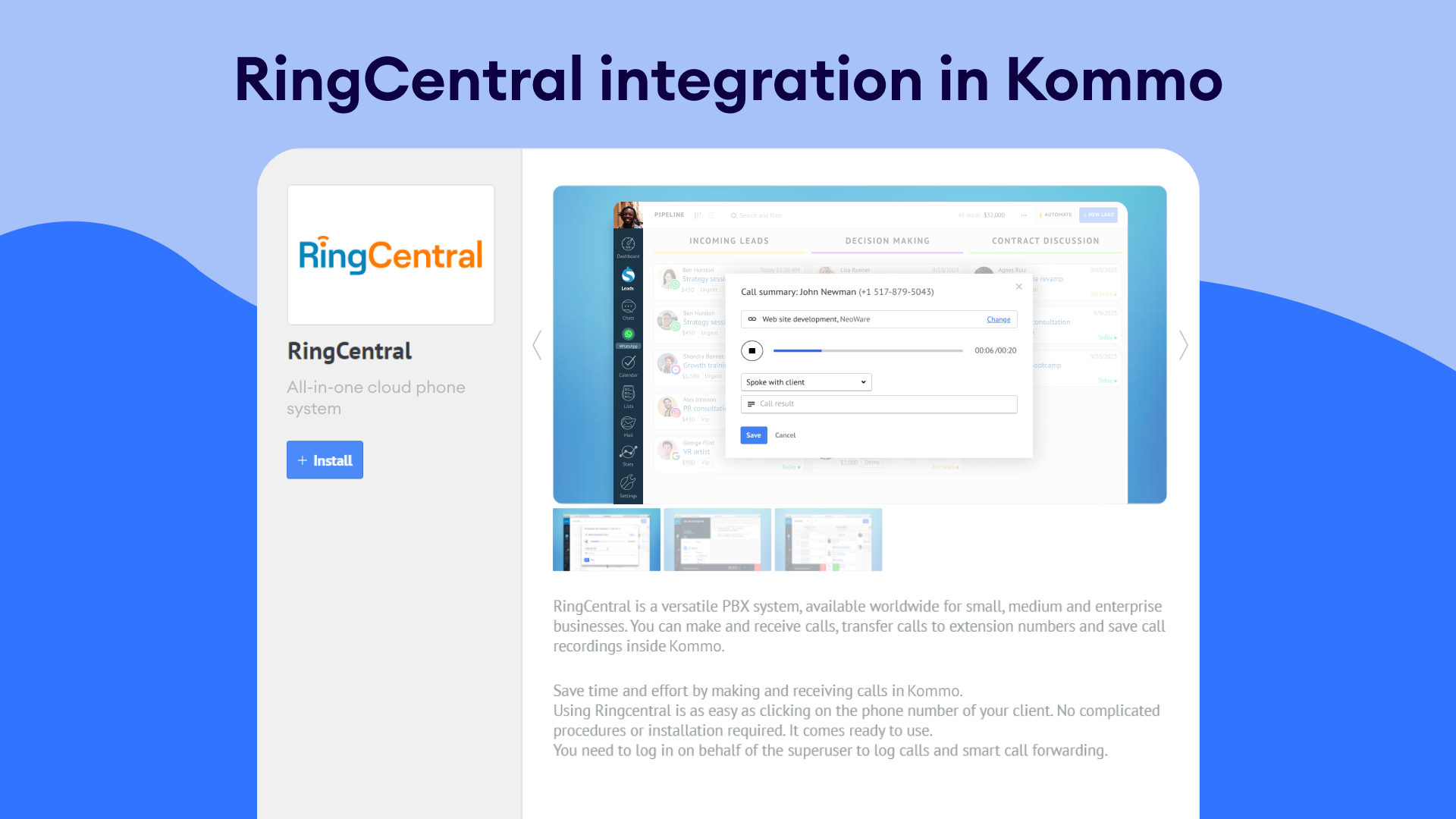 The RingCentral integration empowers Kommo users to manage all voice communication directly within the CRM. With features like click-to-call, automatic logging, and call reminders, users can engage leads effectively and efficiently. The seamless integration ensures that all interactions are logged and accessible, providing a comprehensive view of each lead's journey. This enhances productivity, improves customer engagement, and streamlines communication processes.