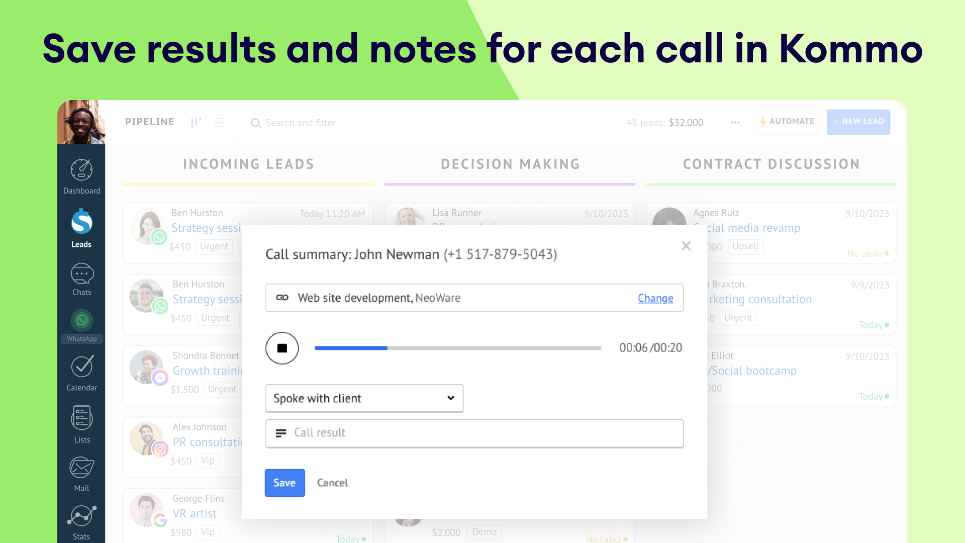 • Automatic call logging: Keep a complete record of call details, including duration and outcome, within each lead card.