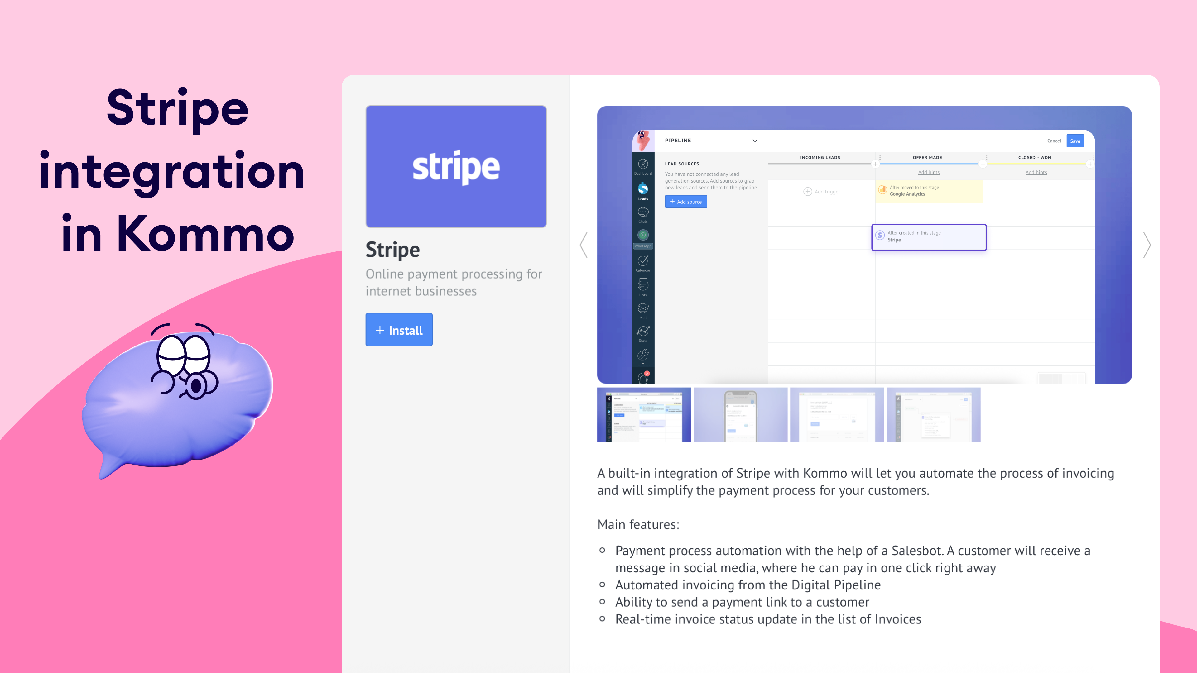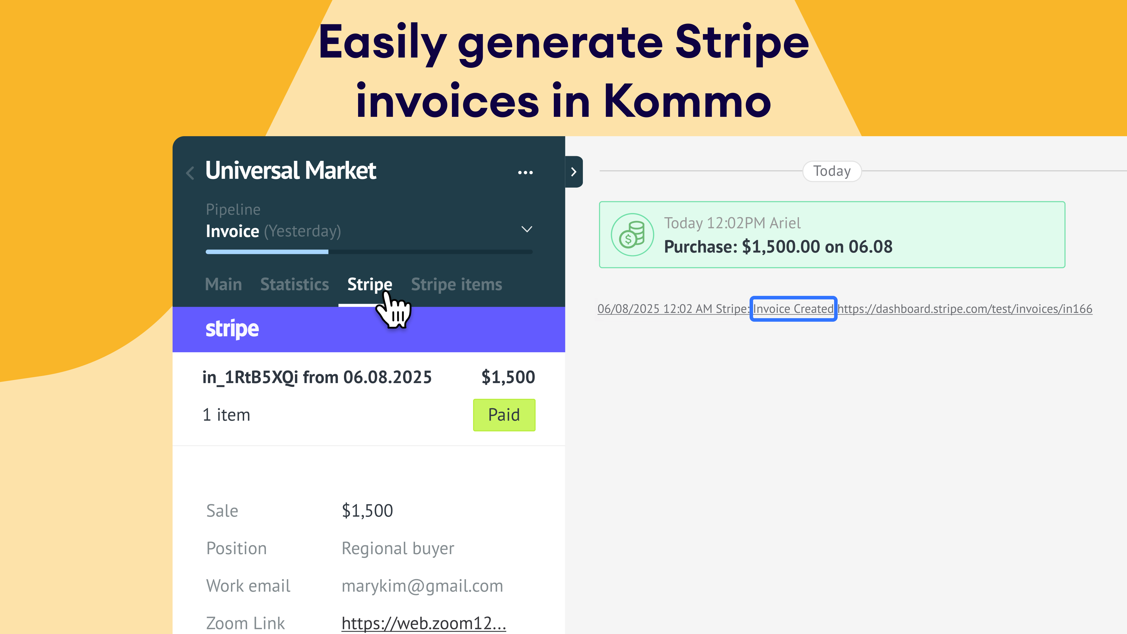 Product synchronization: Sync your Stripe product list with Kommo to ensure consistency and accuracy in your invoicing.