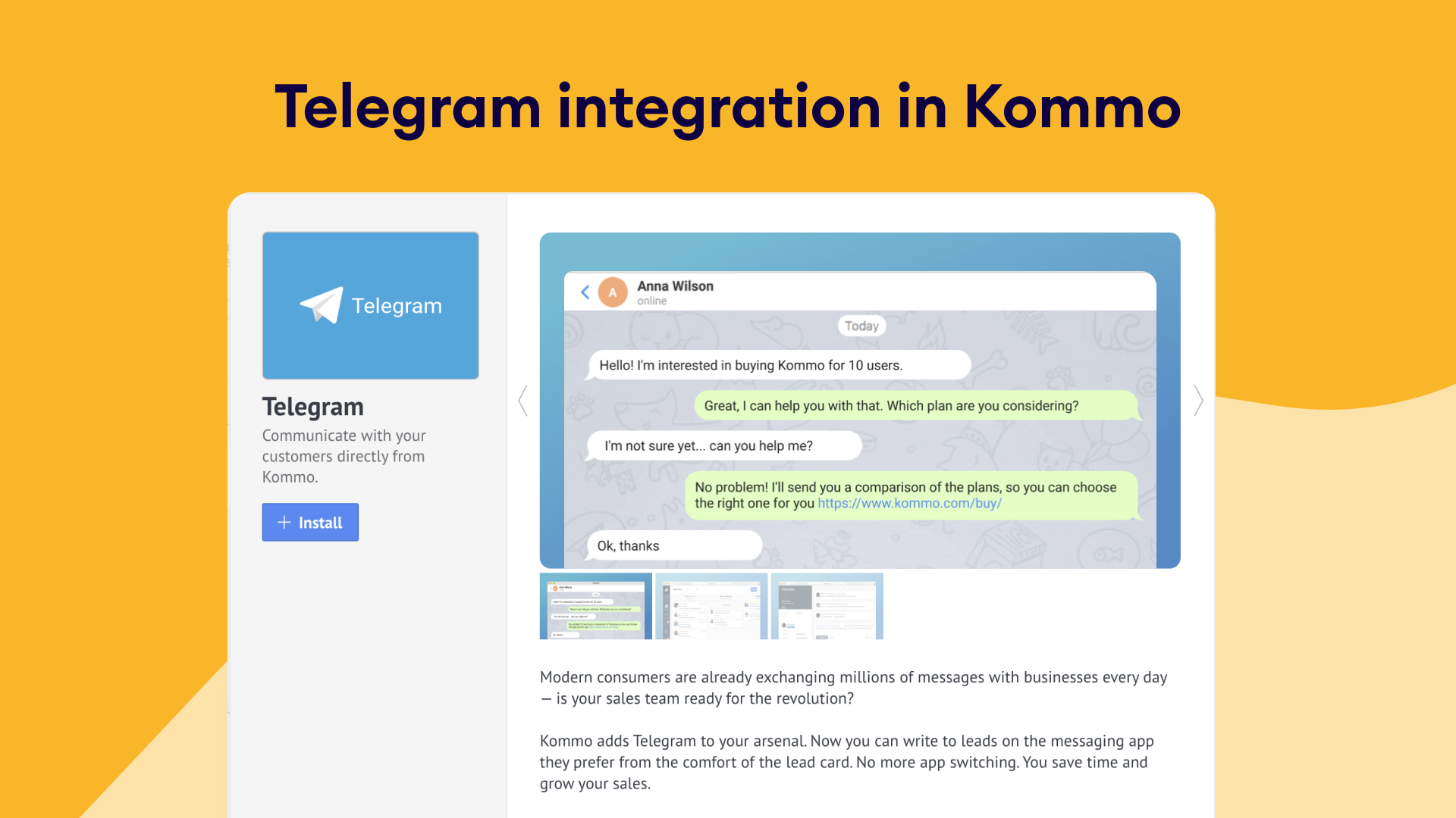 The Telegram integration gives Kommo users a secure and fast way to stay connected with customers. Paired with Kommo’s visual pipelines, Salesbot, and automation features, it extends Telegram beyond simple messaging - turning it into a 24/7 business channel that captures leads, engages prospects, and keeps communication structured inside Kommo.