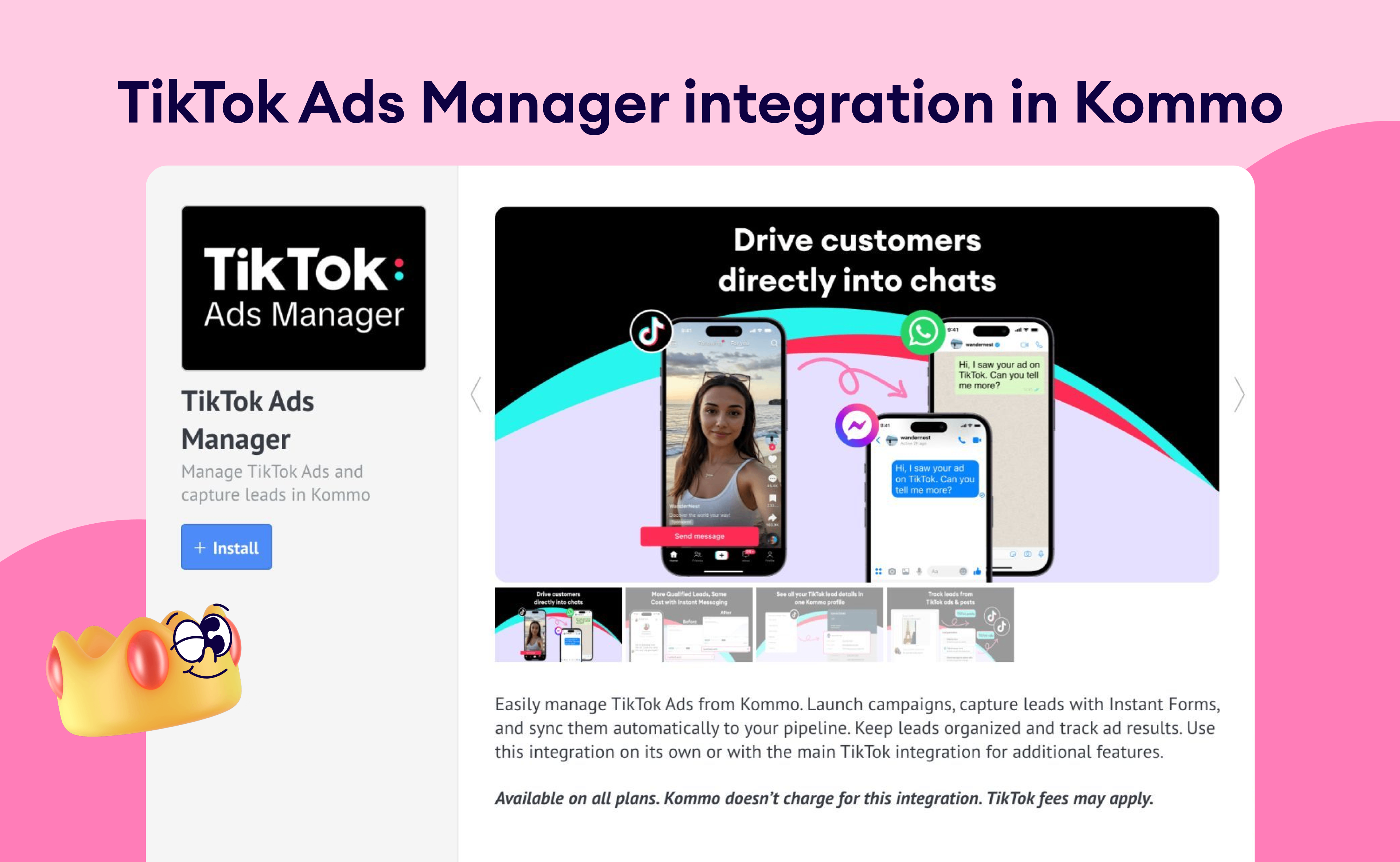 The TikTok Ads Manager integration helps businesses capture and manage leads from TikTok Instant Forms and Instant Messaging Ads directly in Kommo.