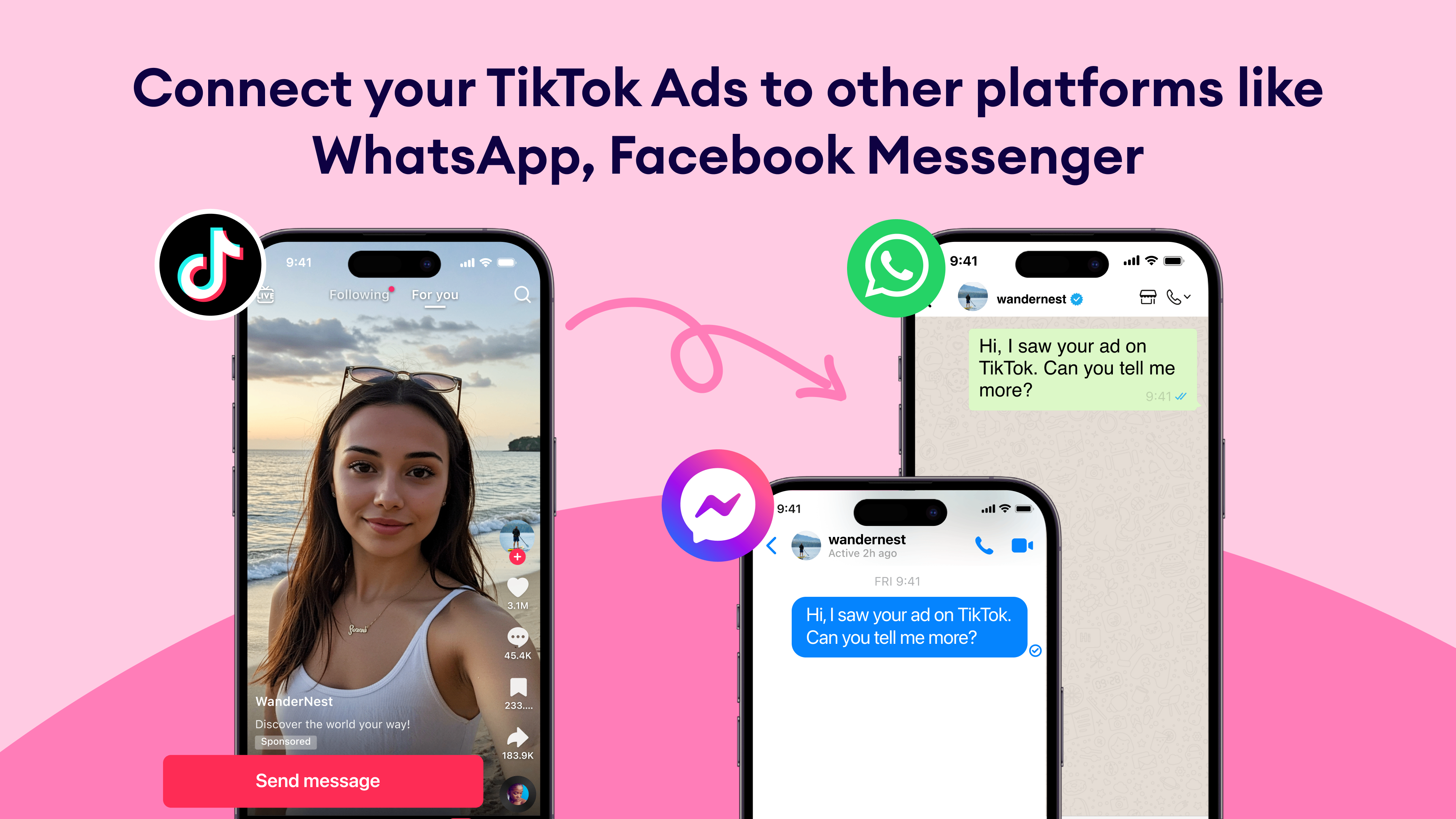 With Instant Messaging Ads, you can link your TikTok ad campaigns to chat channels like WhatsApp, Facebook Messenger, or TikTok chat, allowing users to message you instantly — while Kommo automatically tracks, organizes, and updates all related leads in one place.