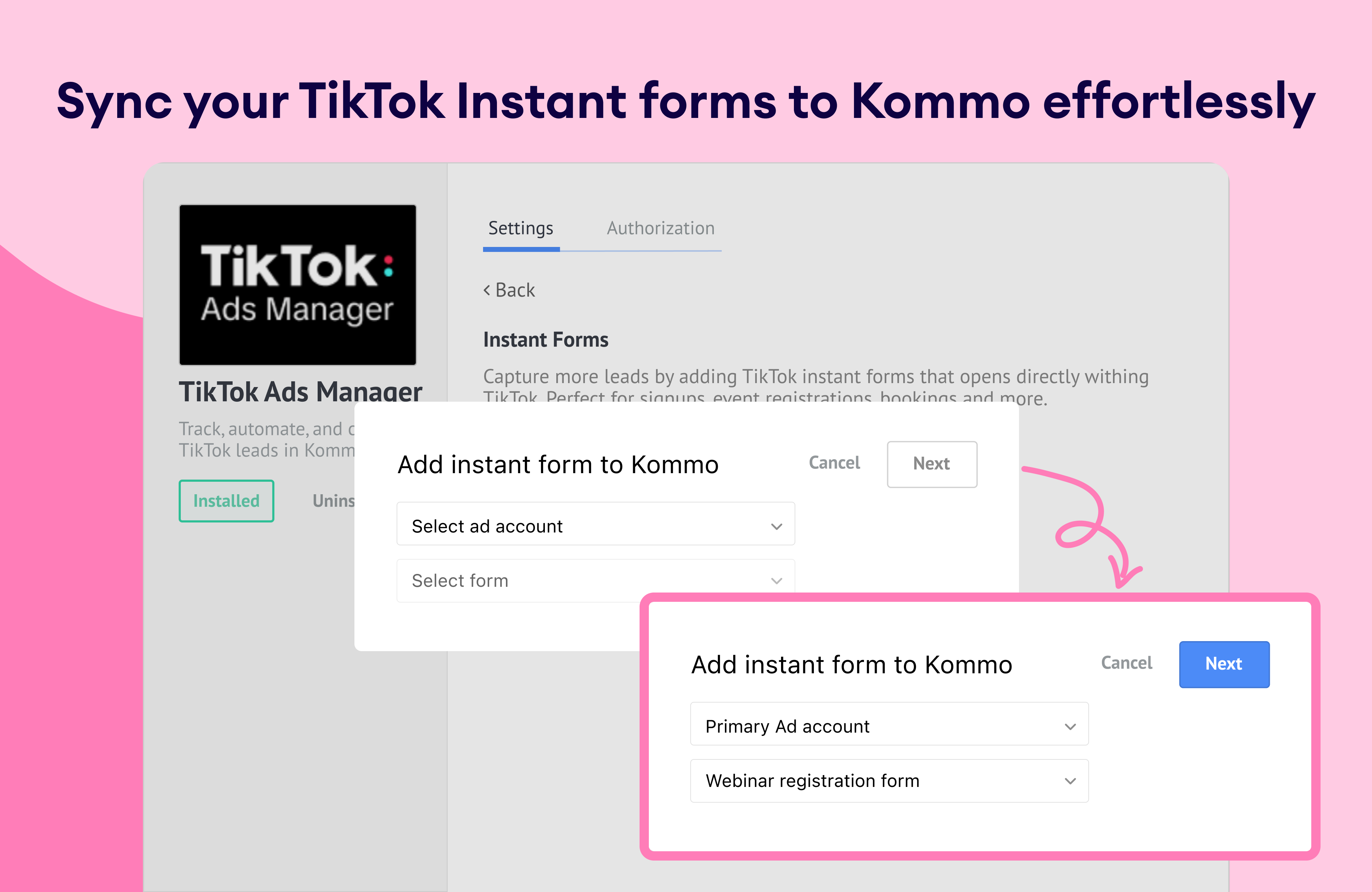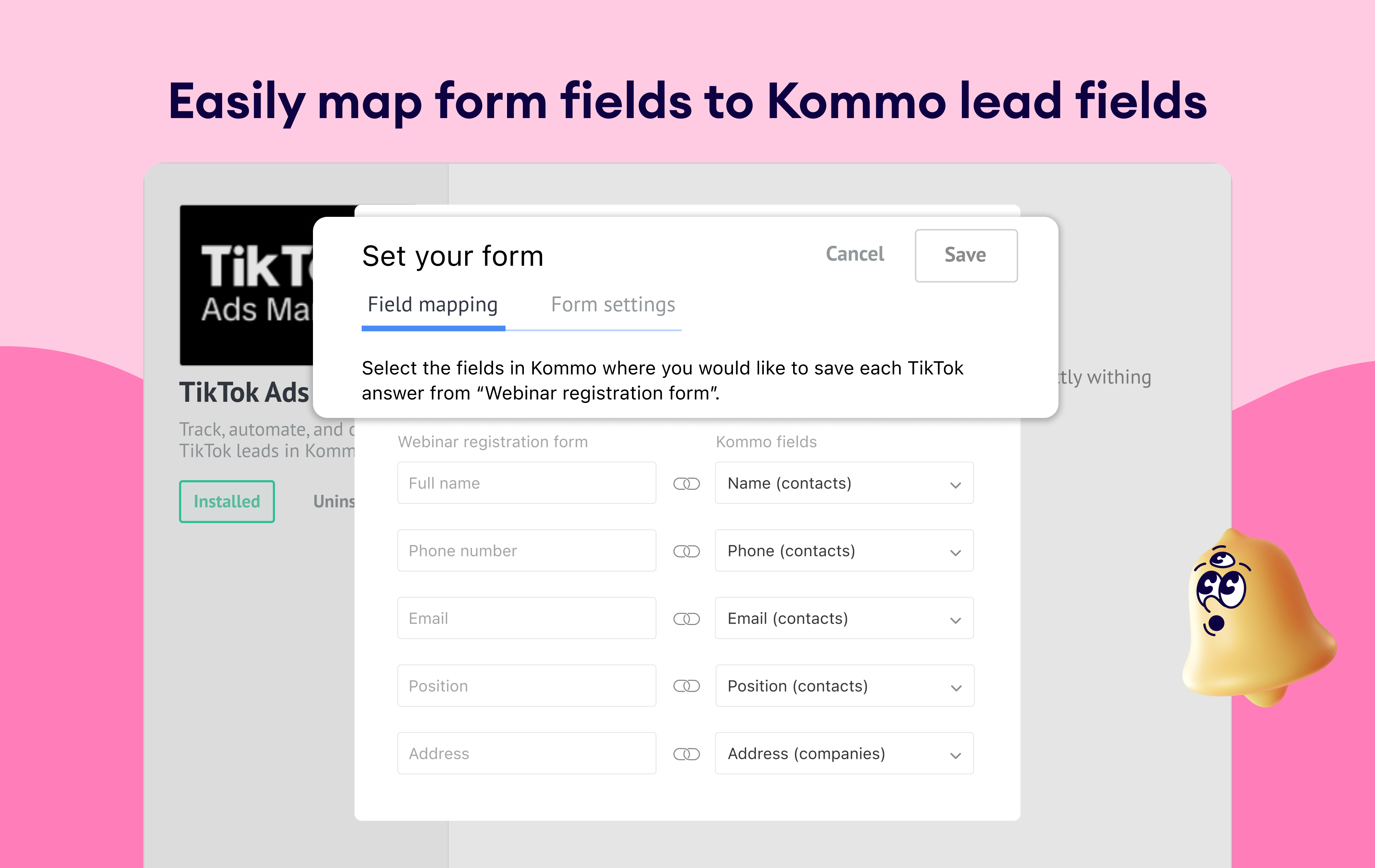Add TikTok Instant Forms by selecting the account, mapping form fields to Kommo fields, and assigning tags or pipeline stages.