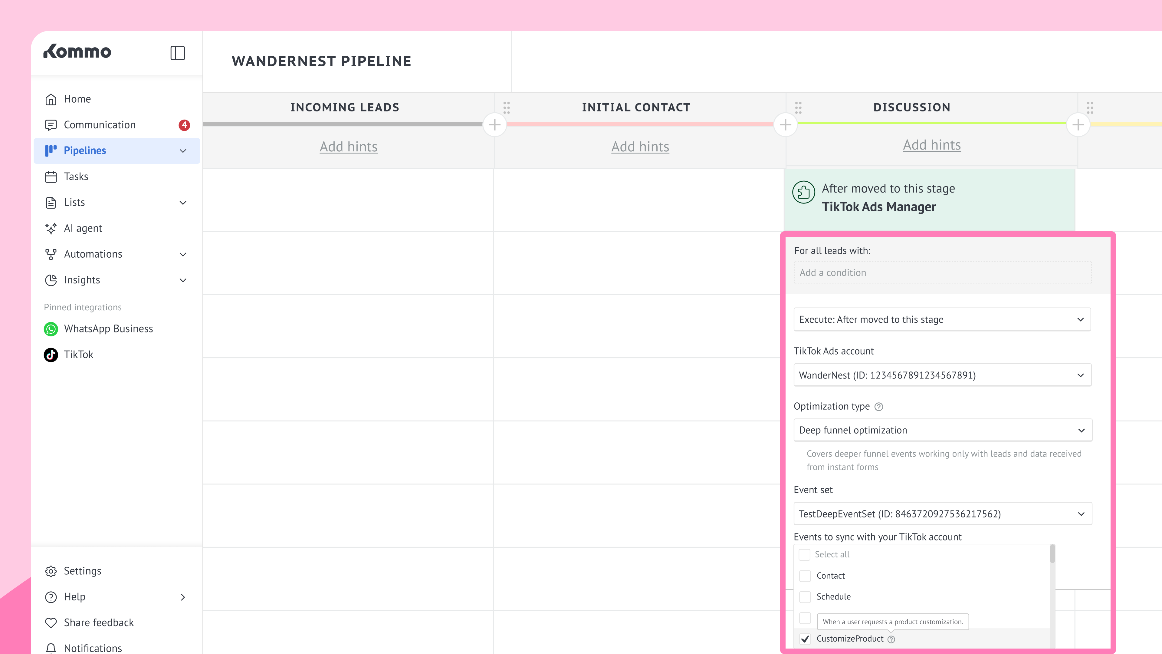 - Set up triggers in your pipelines to automatically send lead activity data back to TikTok Ads Manager for analytics and campaign optimization.