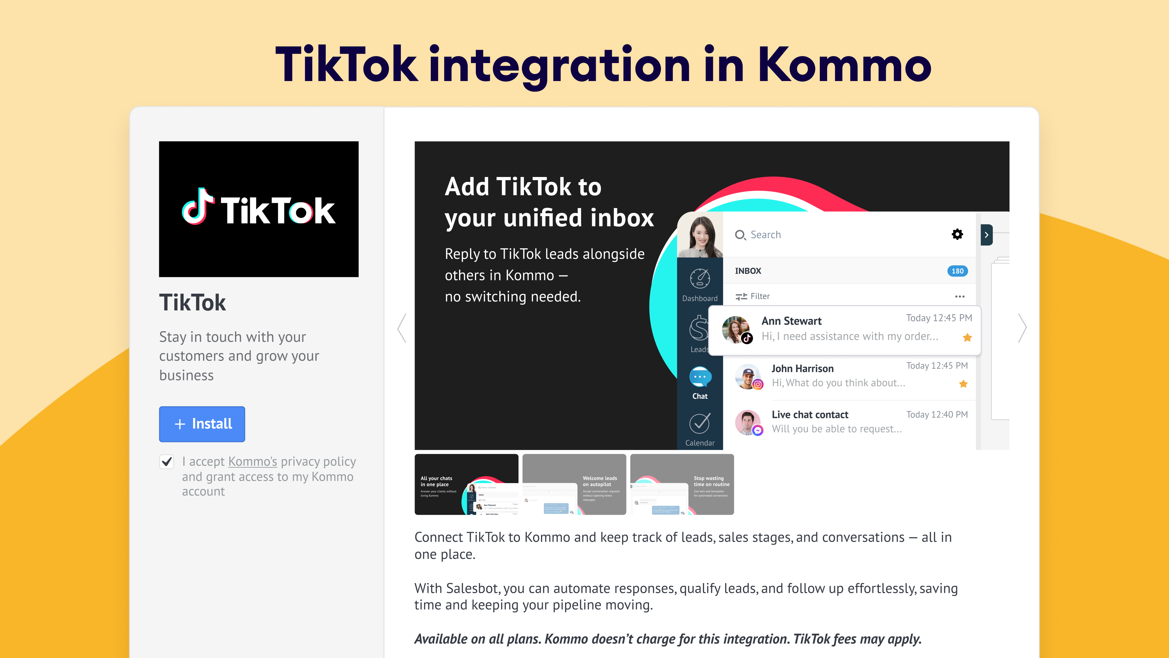 Auto-generate leads: When someone messages your TikTok account, they’re added as a lead in Kommo, no manual input needed.