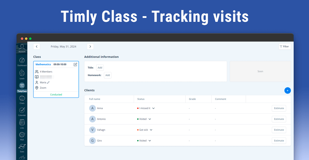 When you integrate Kommo with Timly Class, student and client data syncs seamlessly. This makes it easy to track attendance, manage schedules, renew subscriptions, and more—all within the Kommo interface.