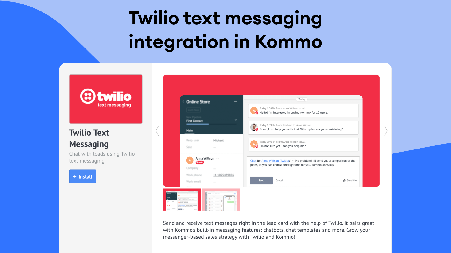 The Twilio text messaging integration in Kommo enables you to send and receive text messages directly from your CRM. By connecting Twilio, you can automate communication workflows, effectively engage leads, and maintain a comprehensive record of all interactions. This integration enhances your ability to reach customers through SMS, ensuring timely and personalized communication.