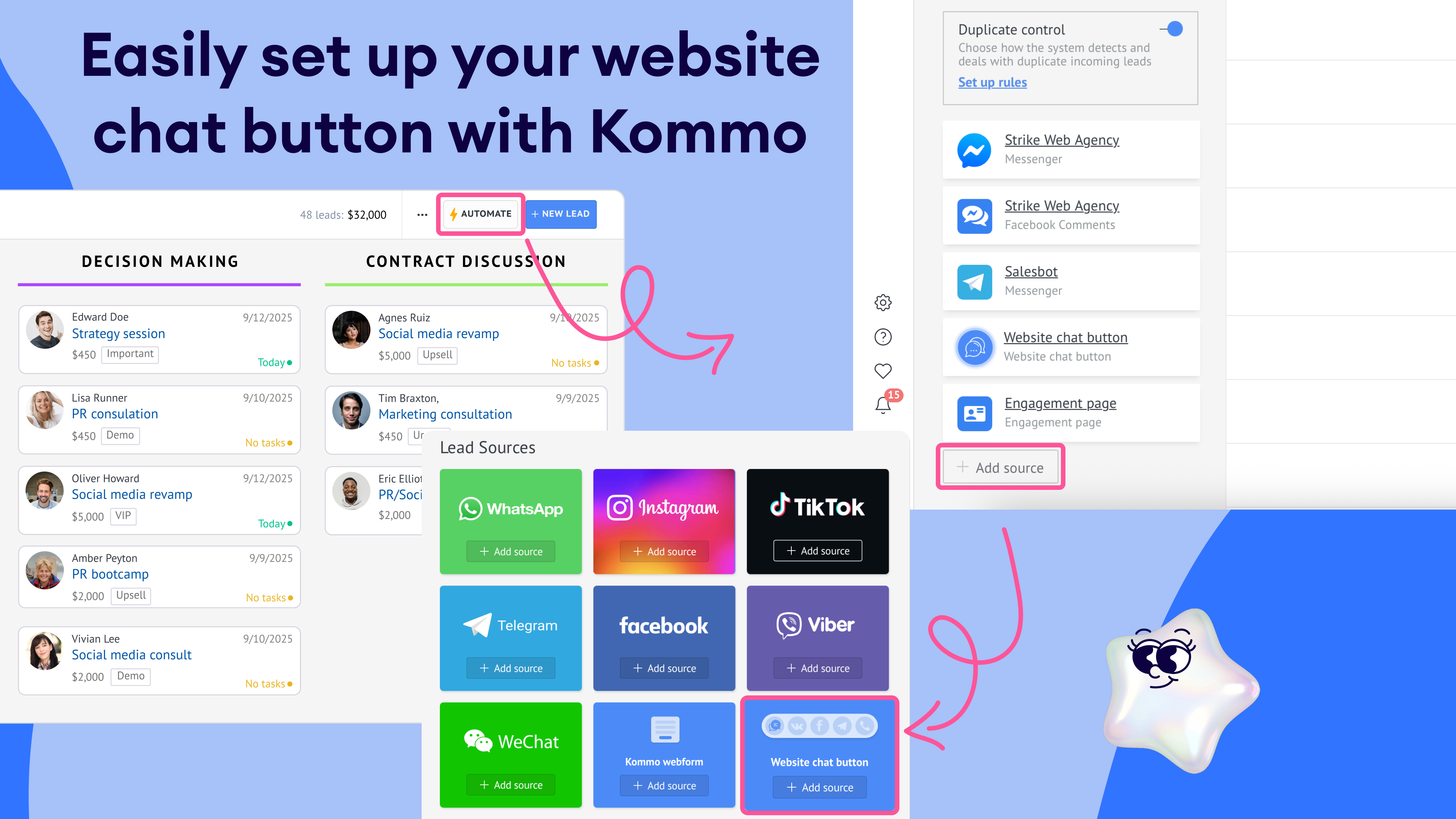 With Kommo’s Website chat button, you turn your site into a powerful lead generation tool. All conversations are centralized inside Kommo’s multichannel CRM, where you can use visual pipelines, automations, and follow-ups to close deals faster. No lead slips away, and your sales and support teams stay perfectly in sync.