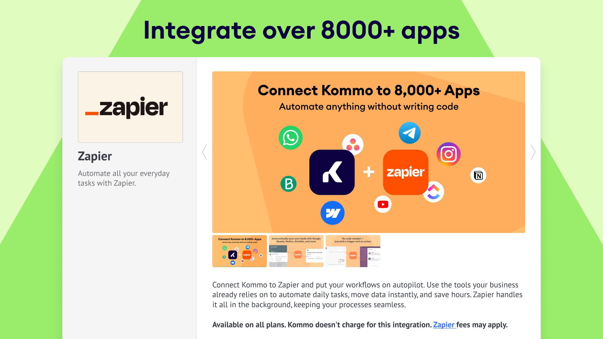 - Set up Zaps using pre-built templates or custom triggers and actions to transfer data seamlessly between Kommo and your apps.