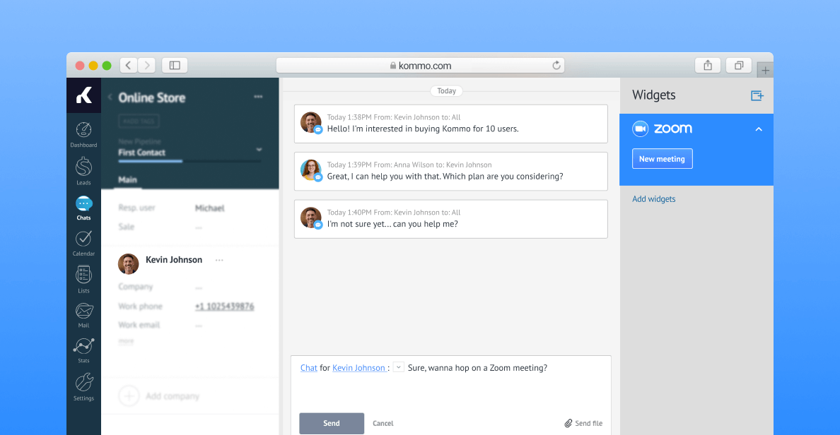 The new integration allows you to make a video call with every lead. Now you can find the New meeting button in the lead card and send the invitation to a Zoom meeting either via email or messenger. It only takes a few clicks to set up and run an online meeting your leads will love.
