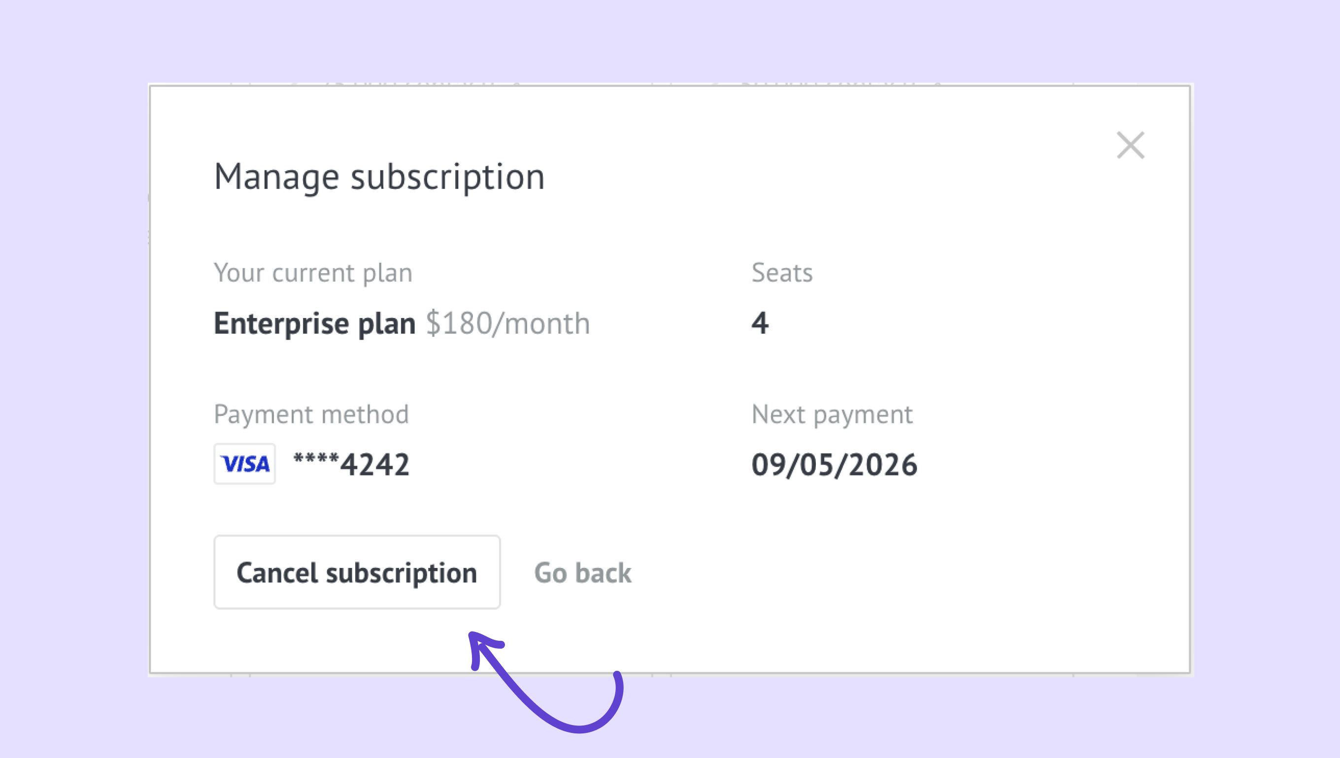 Click Cancel subscription. Select a reason, confirm, and complete cancellation. Once done, your payment method will be removed.