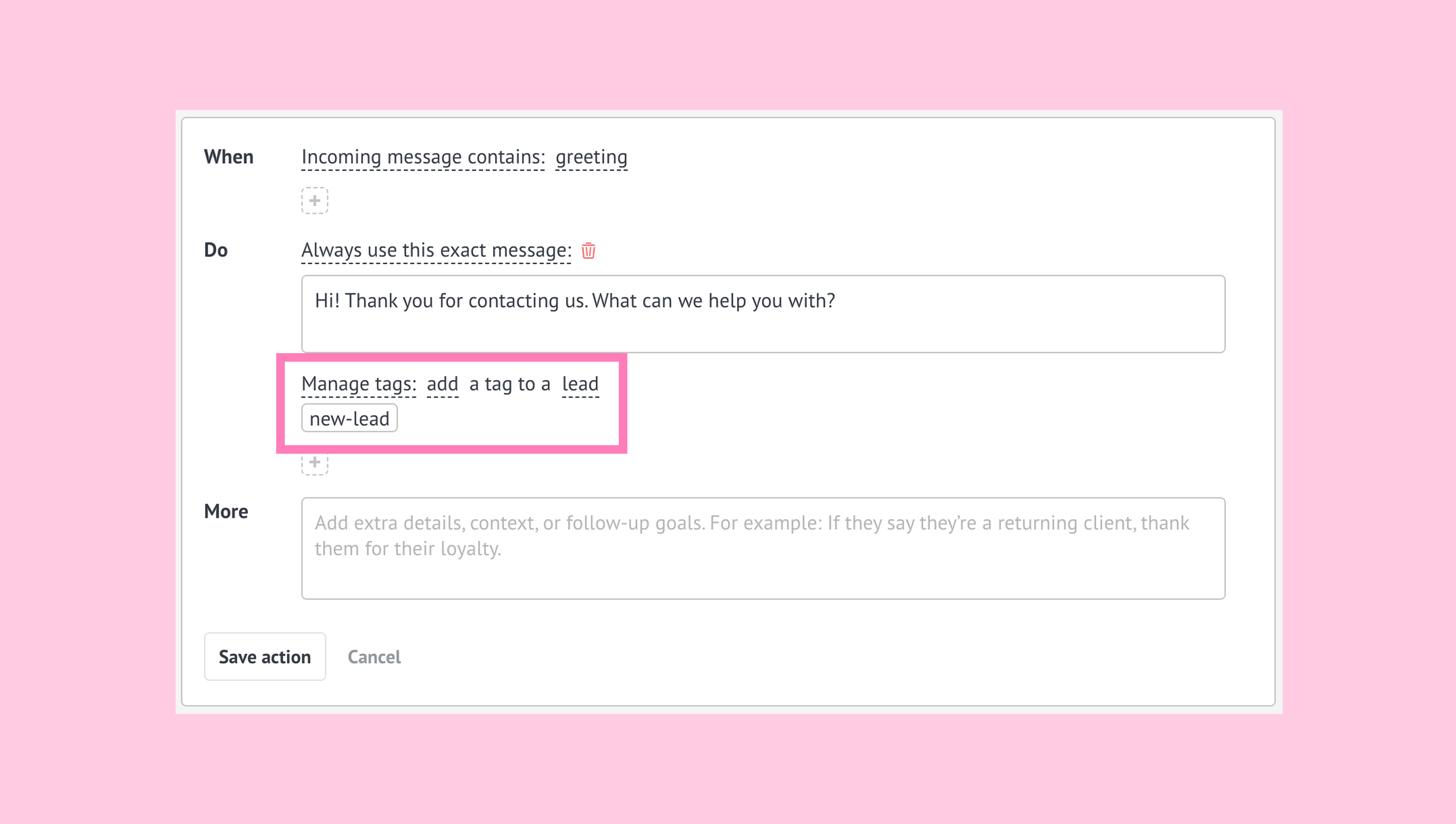Select the DO actions Always use this exact message and add a welcome message. For example: ‘Hi! Thank you for contacting us. What can we help you with?’