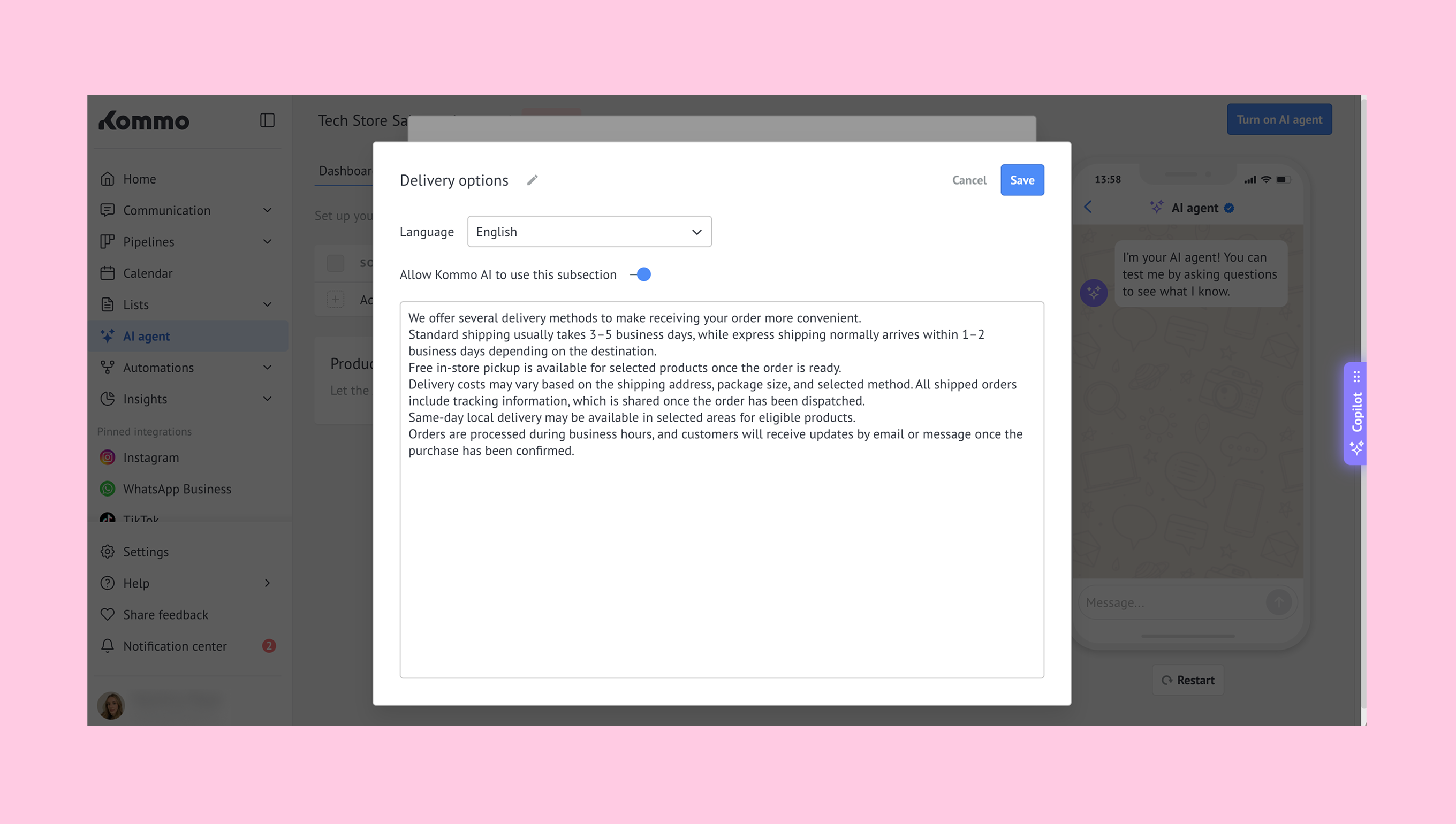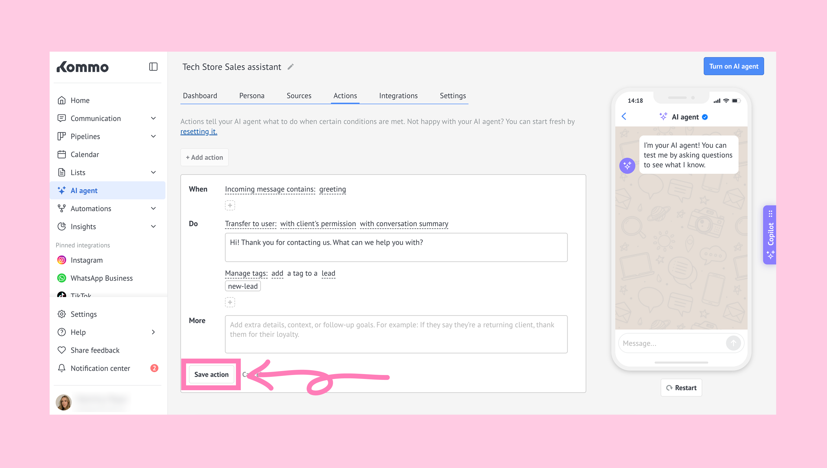 Note: Before launching the AI agent, we recommend using Test mode to review how it responds in different situations and make sure each action works as expected. Try messages such as asking about pricing, requesting more information before buying, or asking for support. If needed, update the relevant WHEN, DO, or More instructions. Learn more in our article about Testing the AI agent.