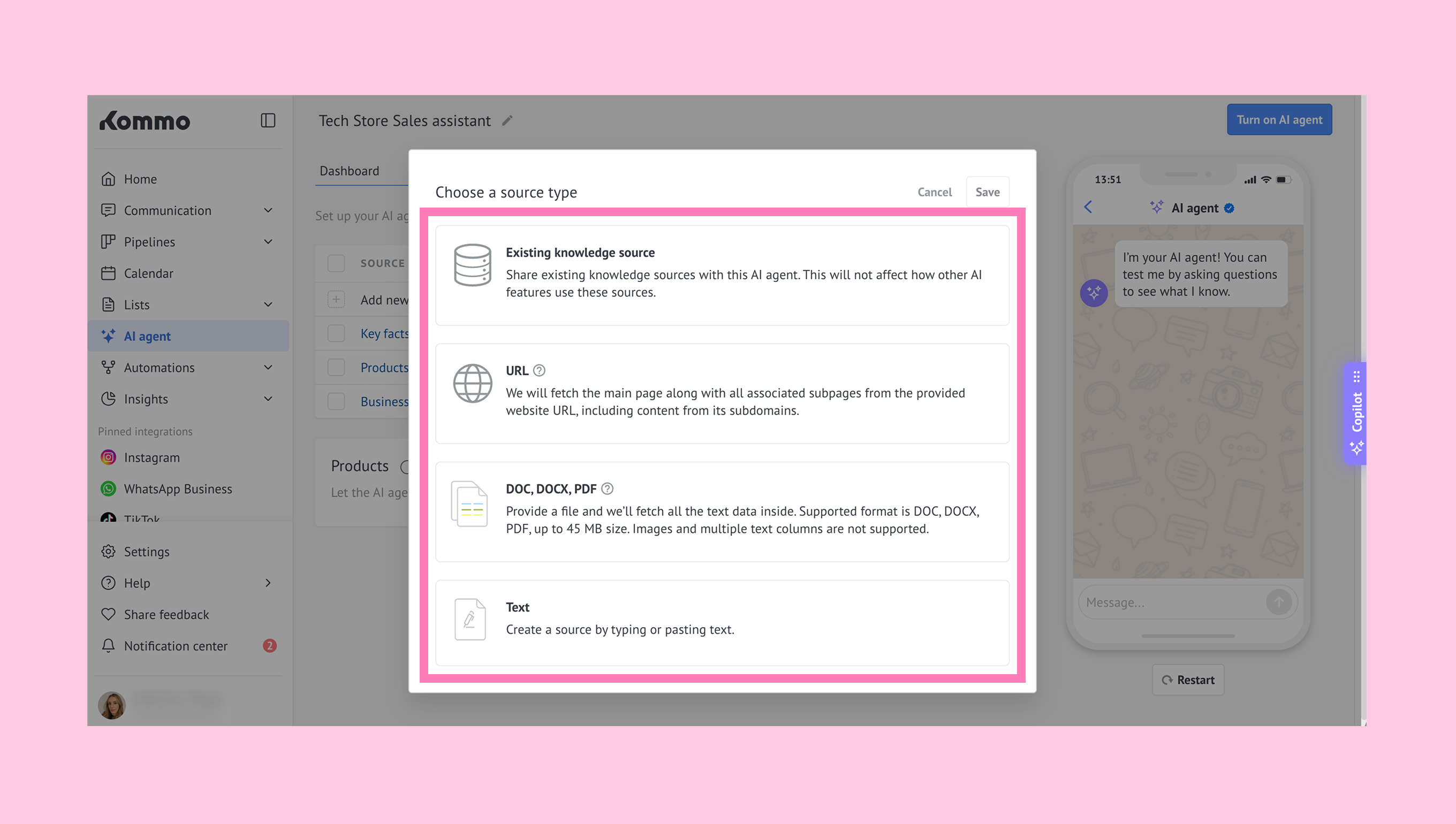 - Choose a source type (Existing knowledge source, URL, DOC, DOCX, PDF or Text) and add information your AI agent can use to answer common customer questions.