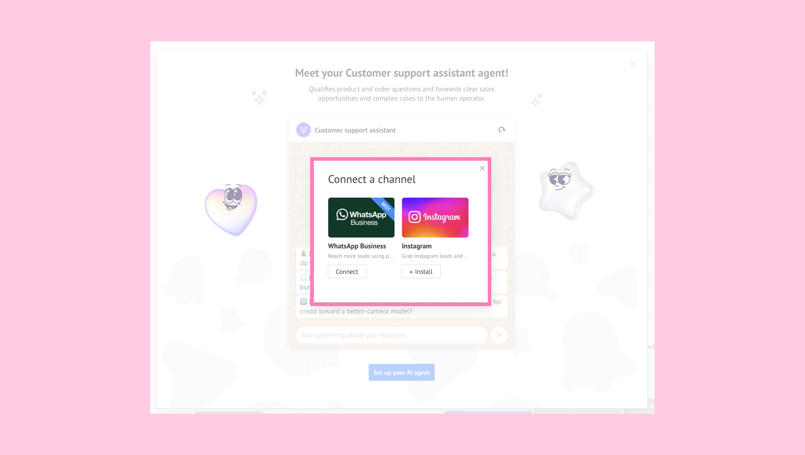 - Connect at least one channel (for example: WhatsApp Business, Instagram, etc).