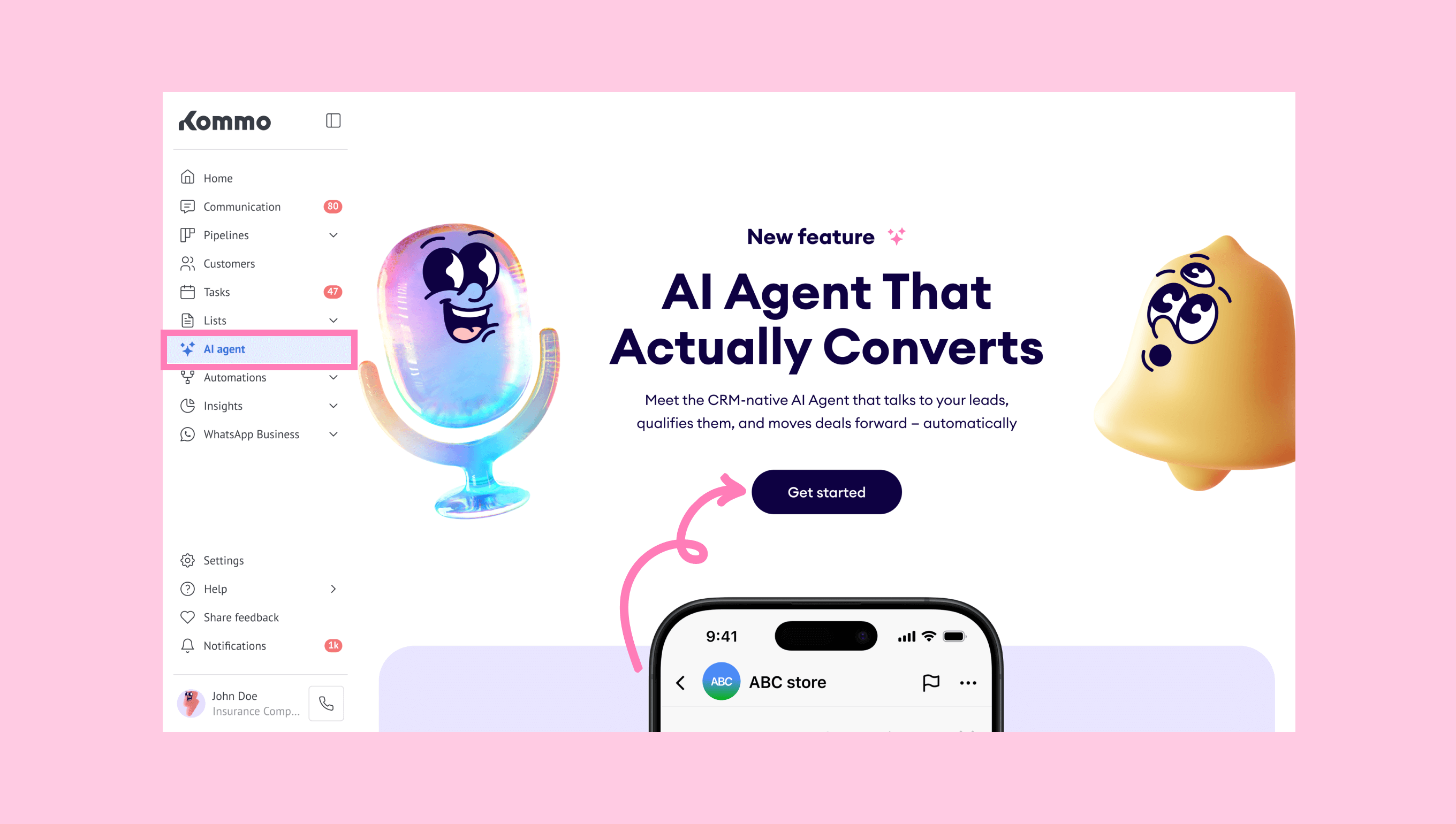 Go to the AI agent section, then click Get started on the landing page.