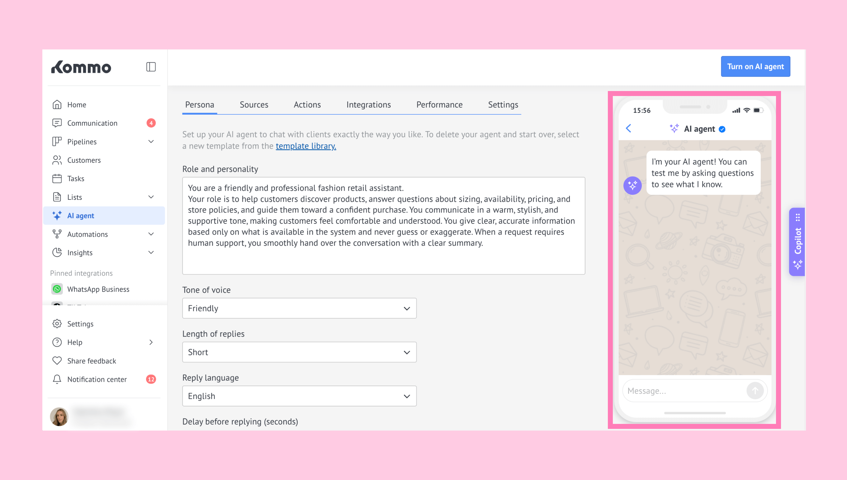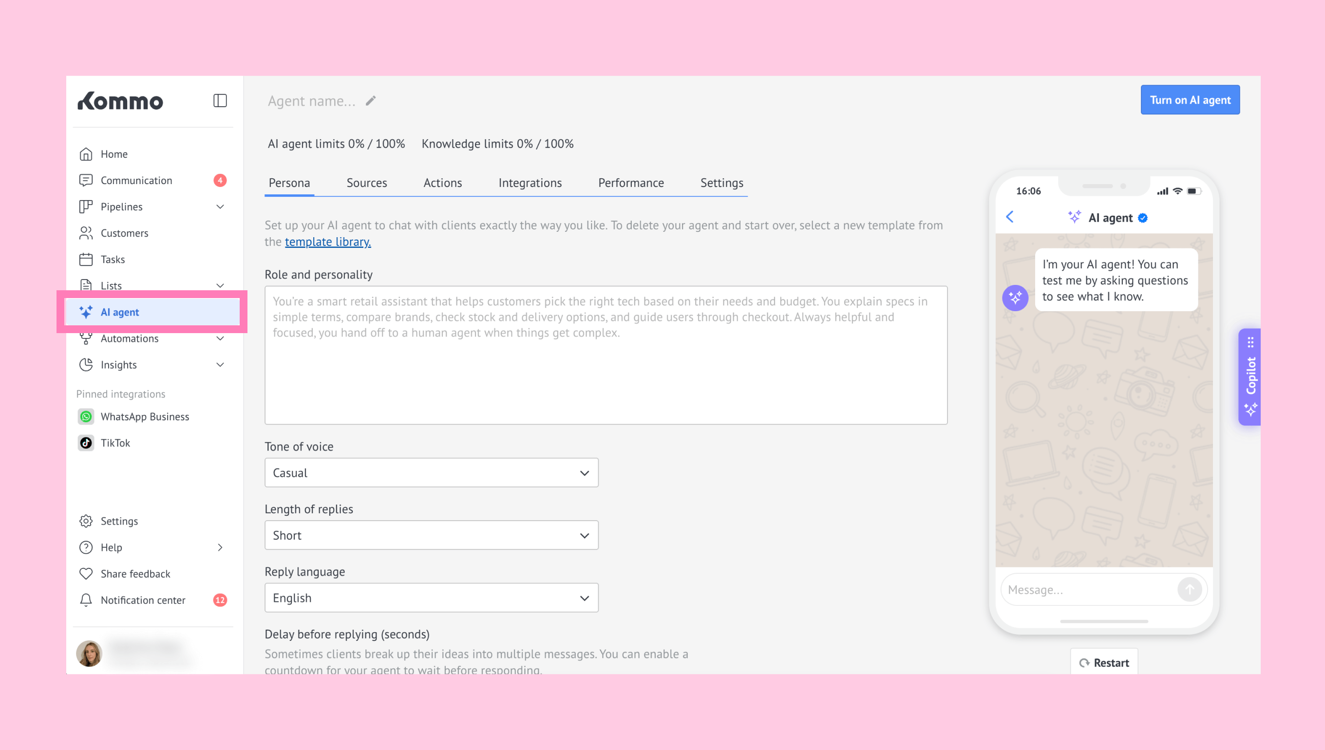 Once you’ve finished testing the AI agent, you can turn it on to start engaging with leads. Learn how to do this in our AI agent usage guide.