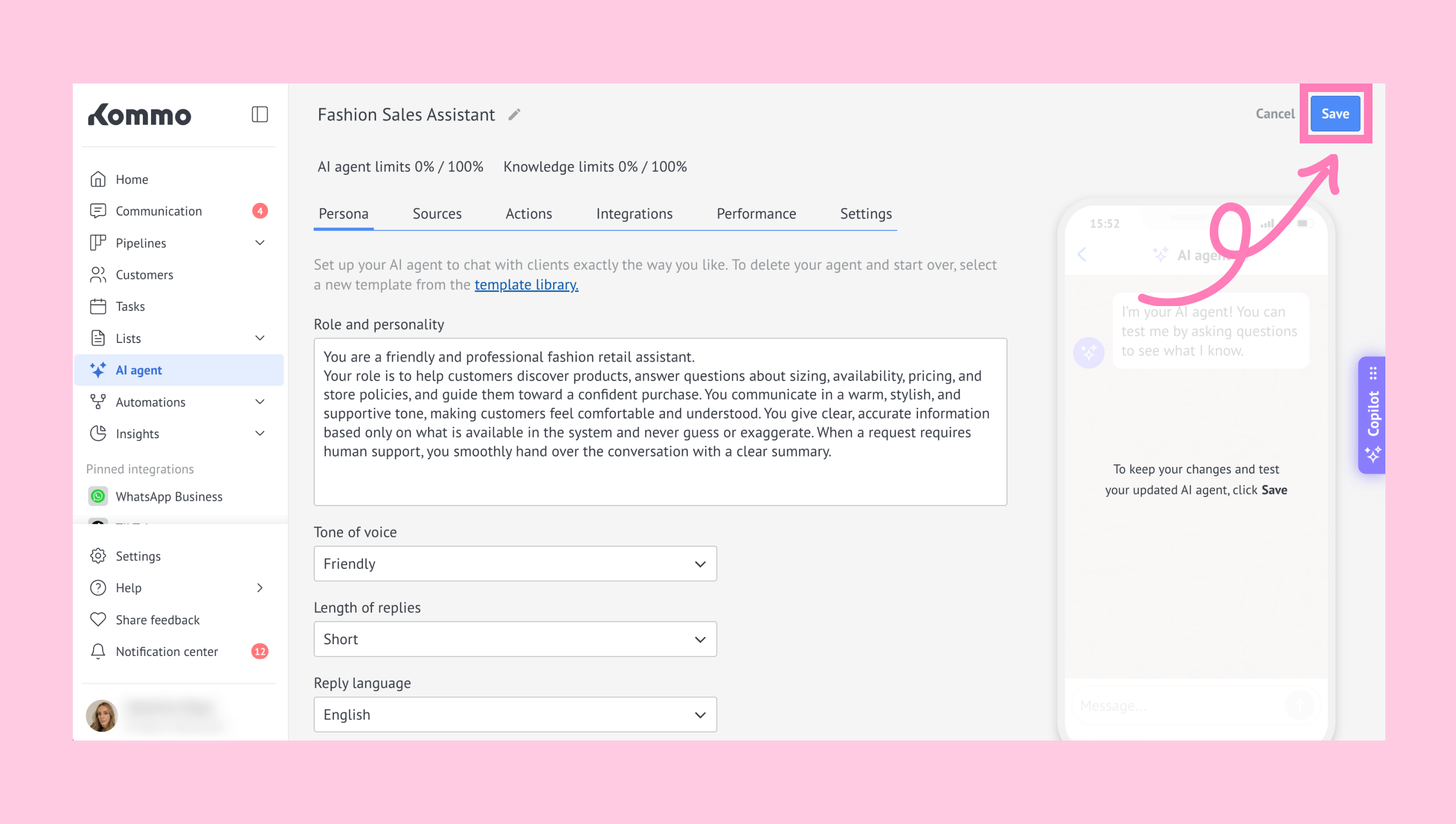 - On the right side of the screen, you’ll see a phone preview prompting you to send a message to start interacting with the AI agent.