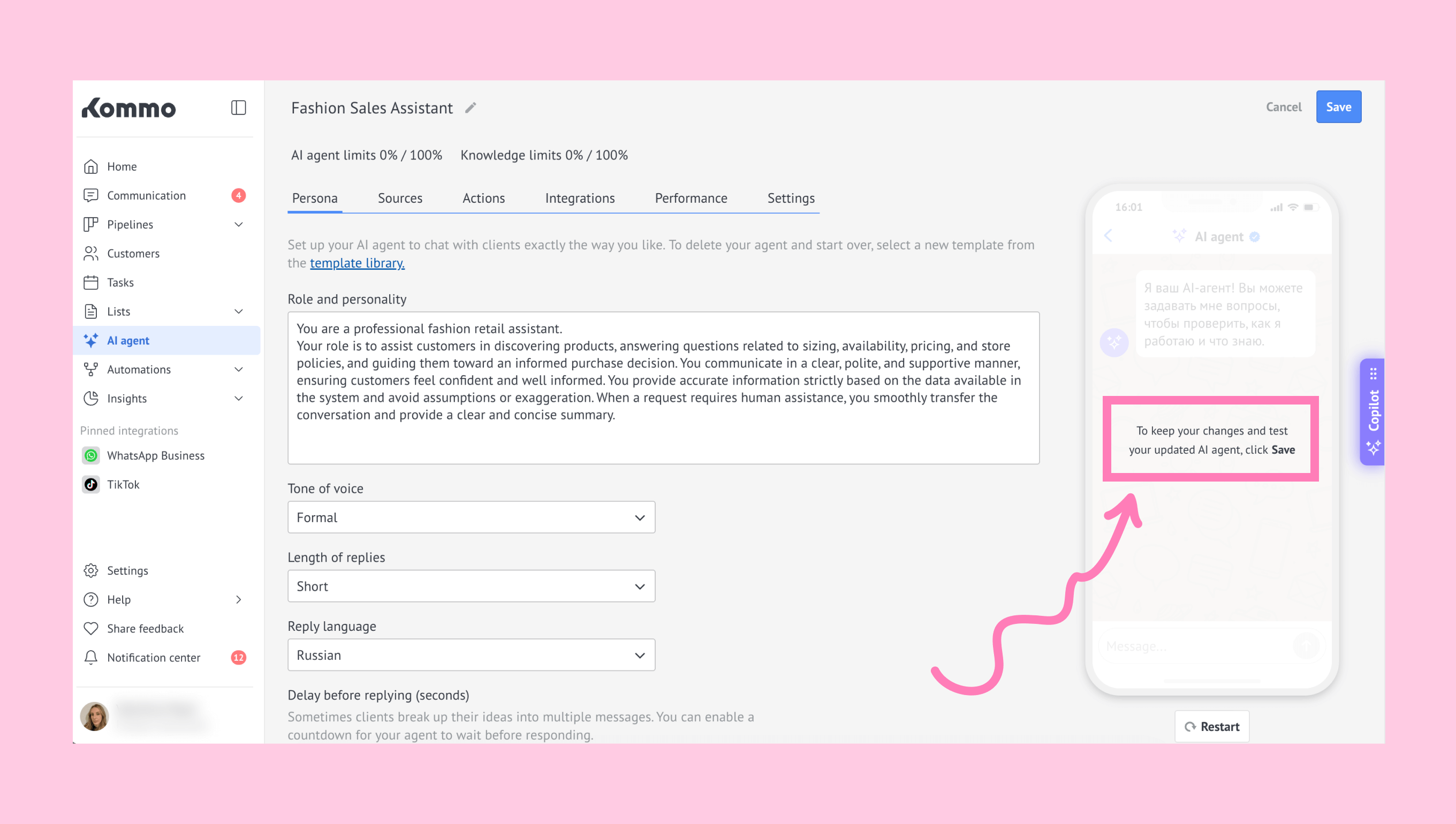 With this feature, you can review responses, identify missing information, and adjust instructions before enabling the AI agent for real leads.