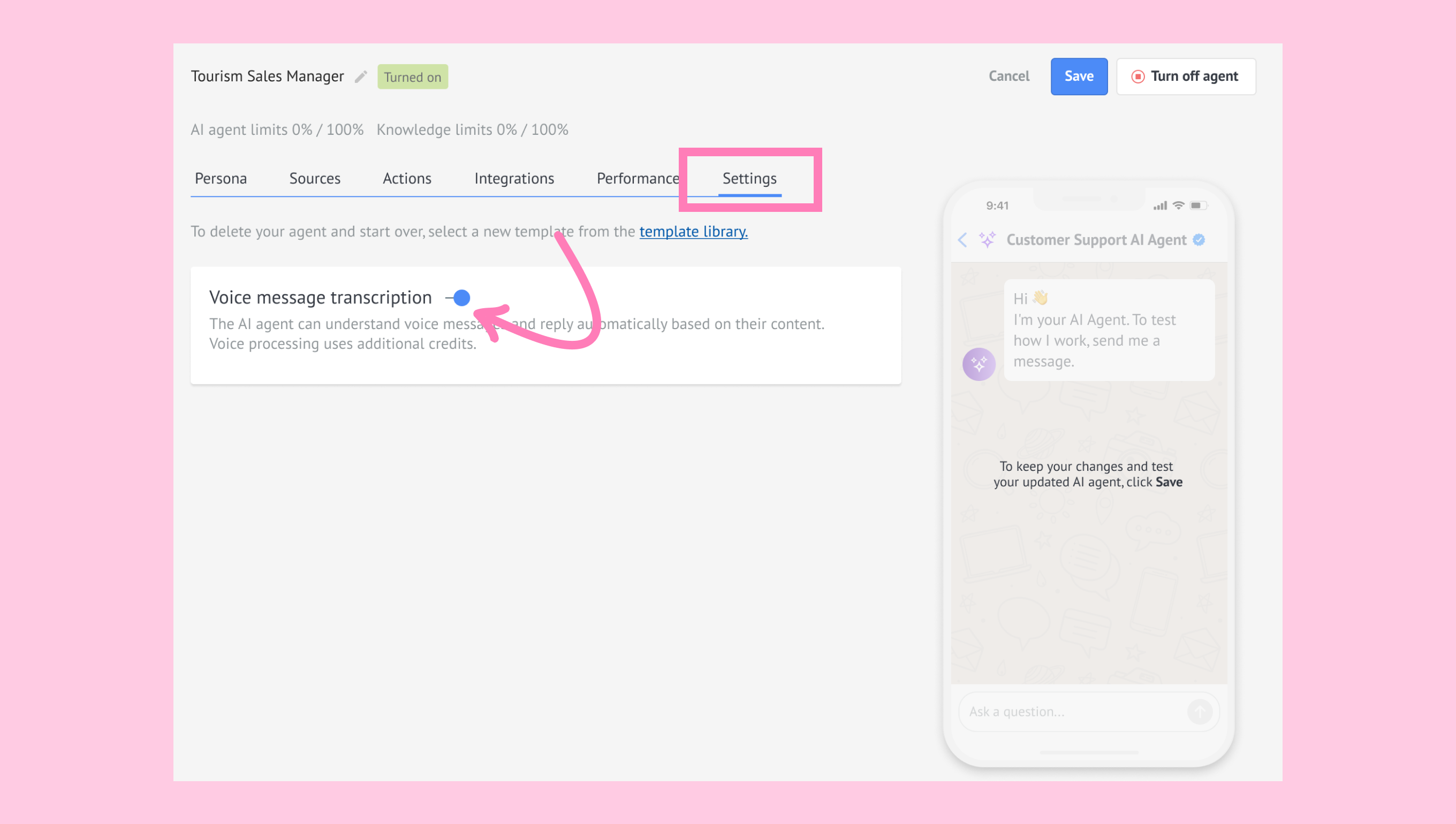 Click Turn on AI agent to activate it.