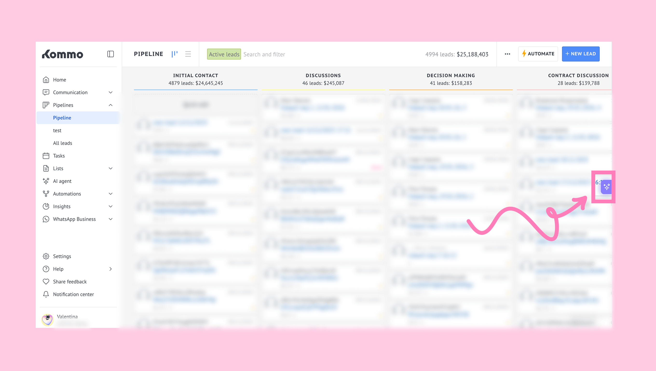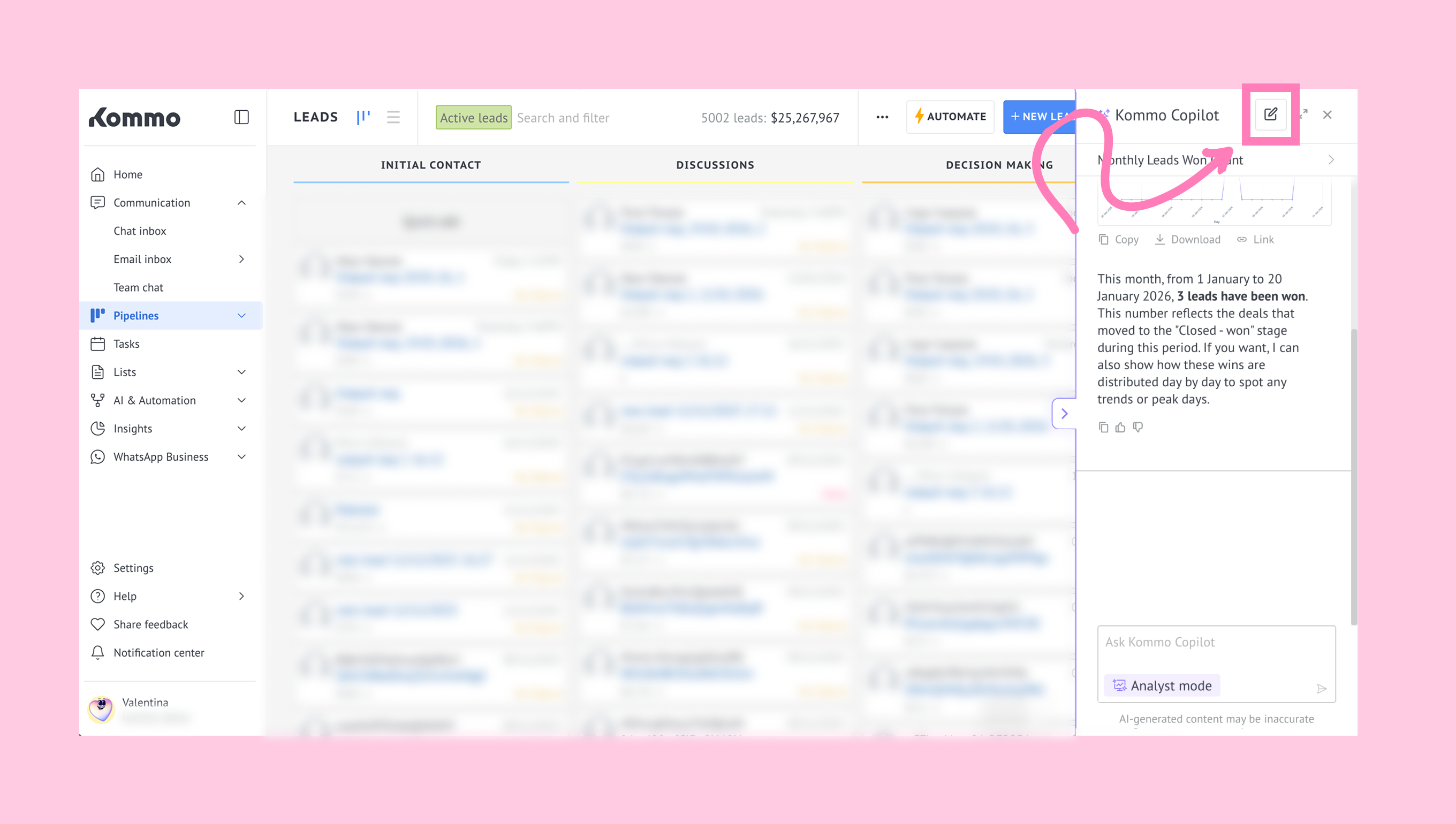 Open Copilot in Kommo by clicking the sparkle icon on the right side of the screen.