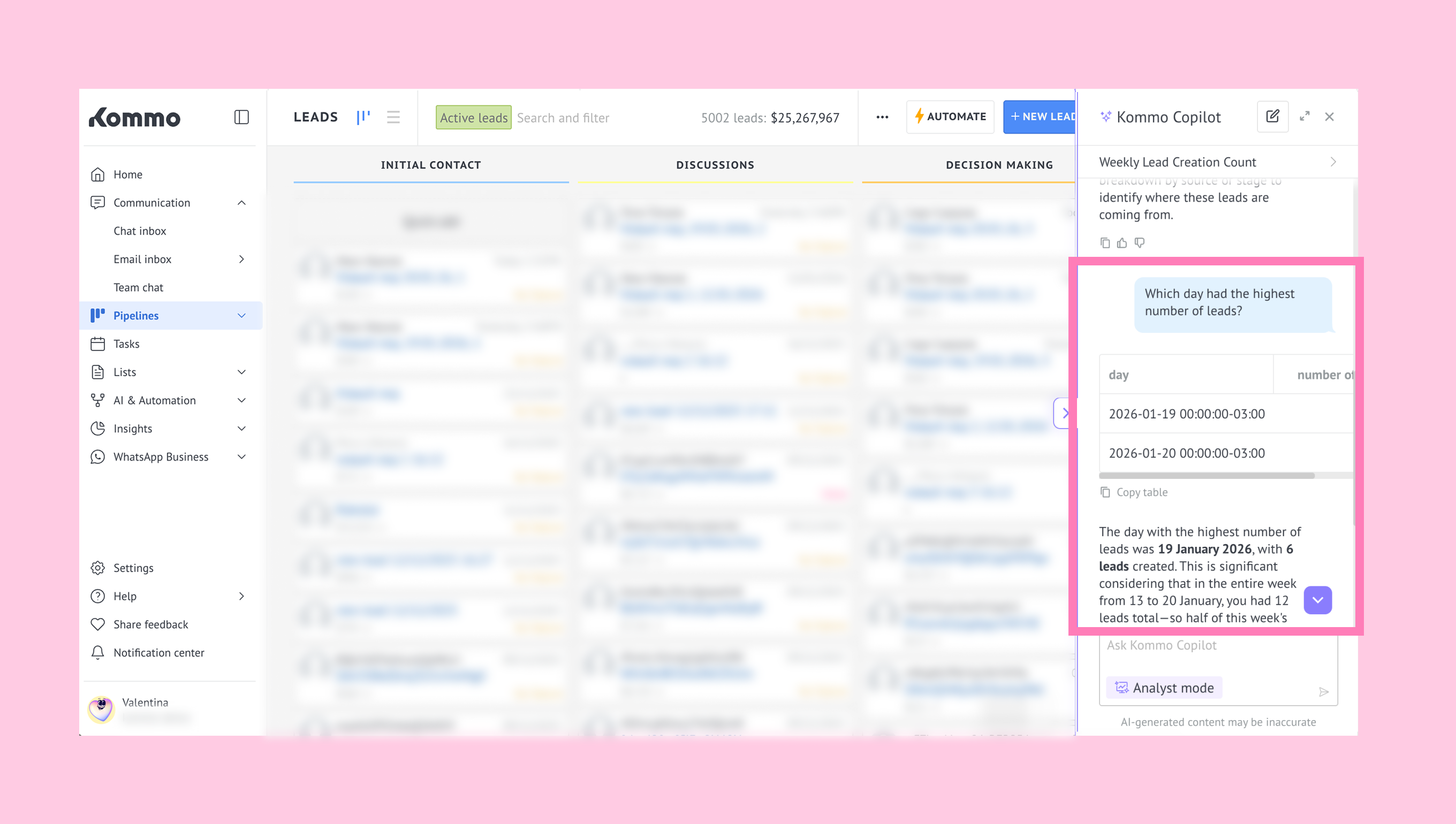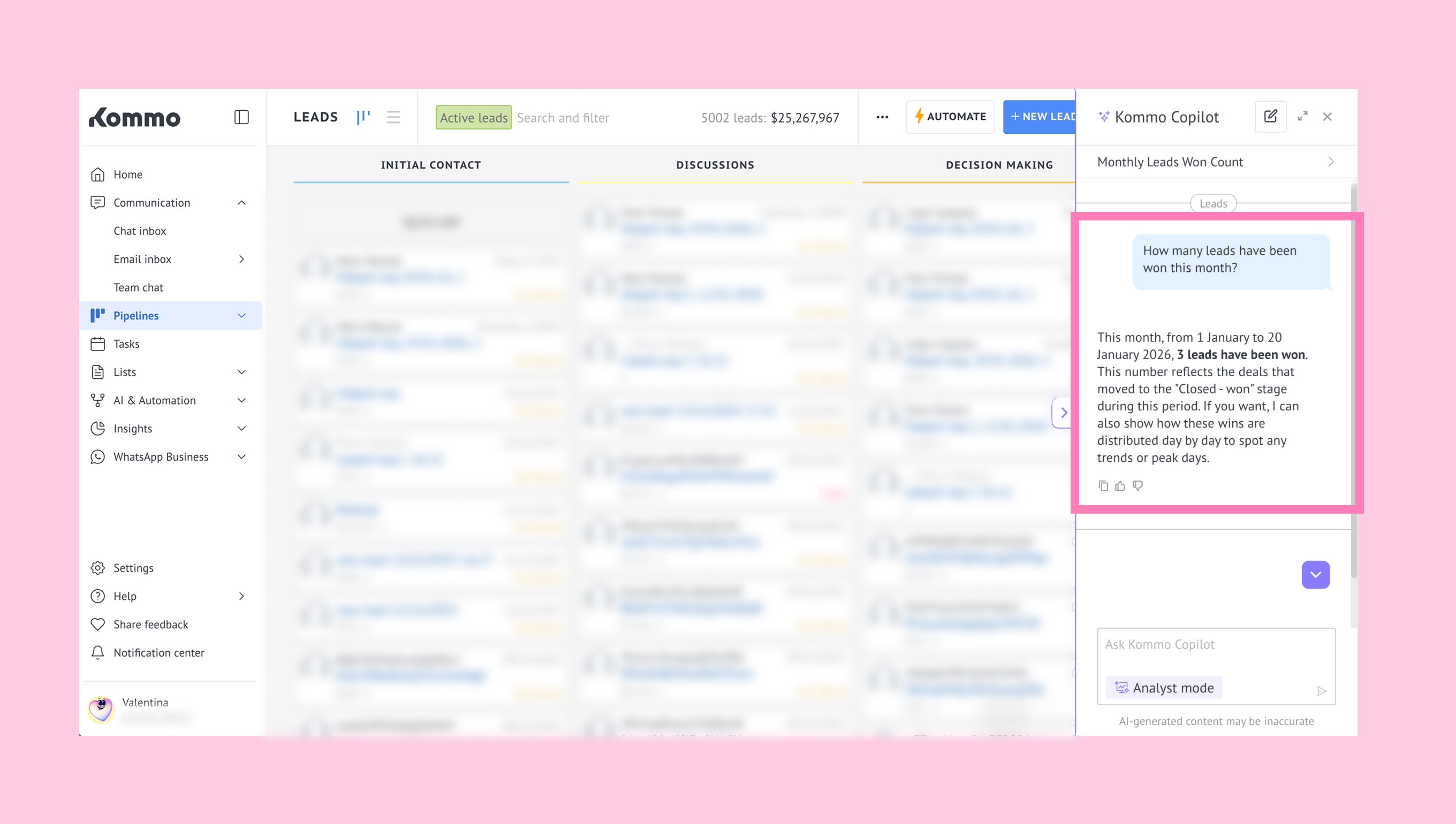 After that, Analyst mode is enabled by Kommo’s Support team for the selected user (seat). Once activation is complete, Analyst mode becomes available in Copilot automatically.