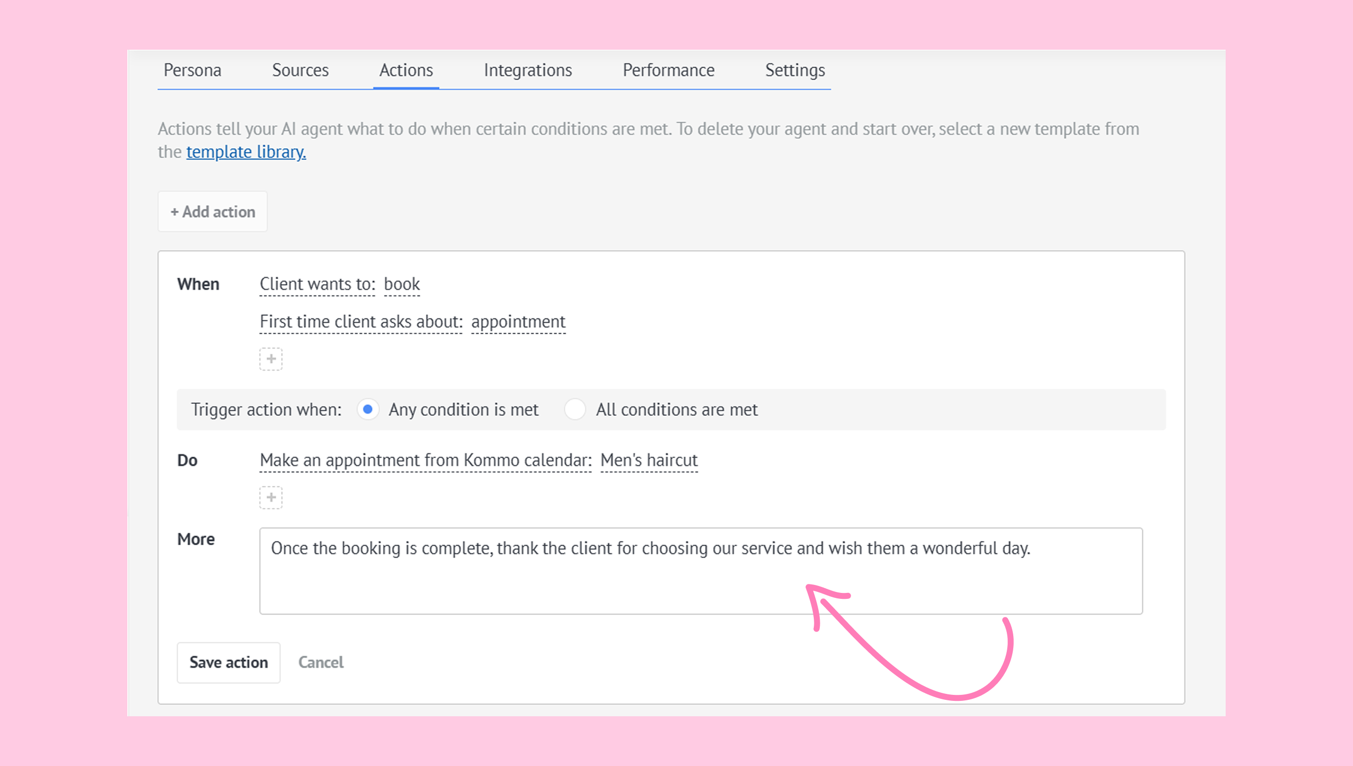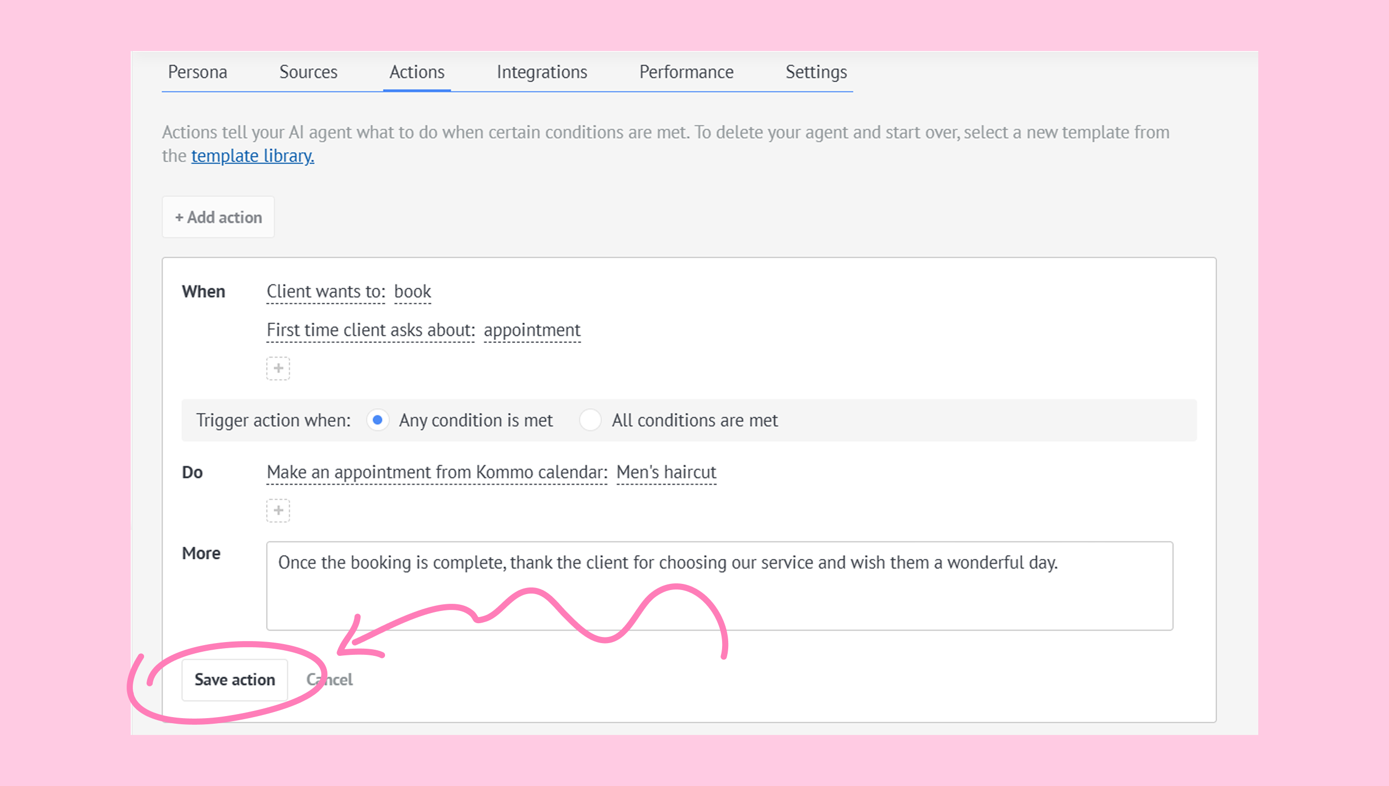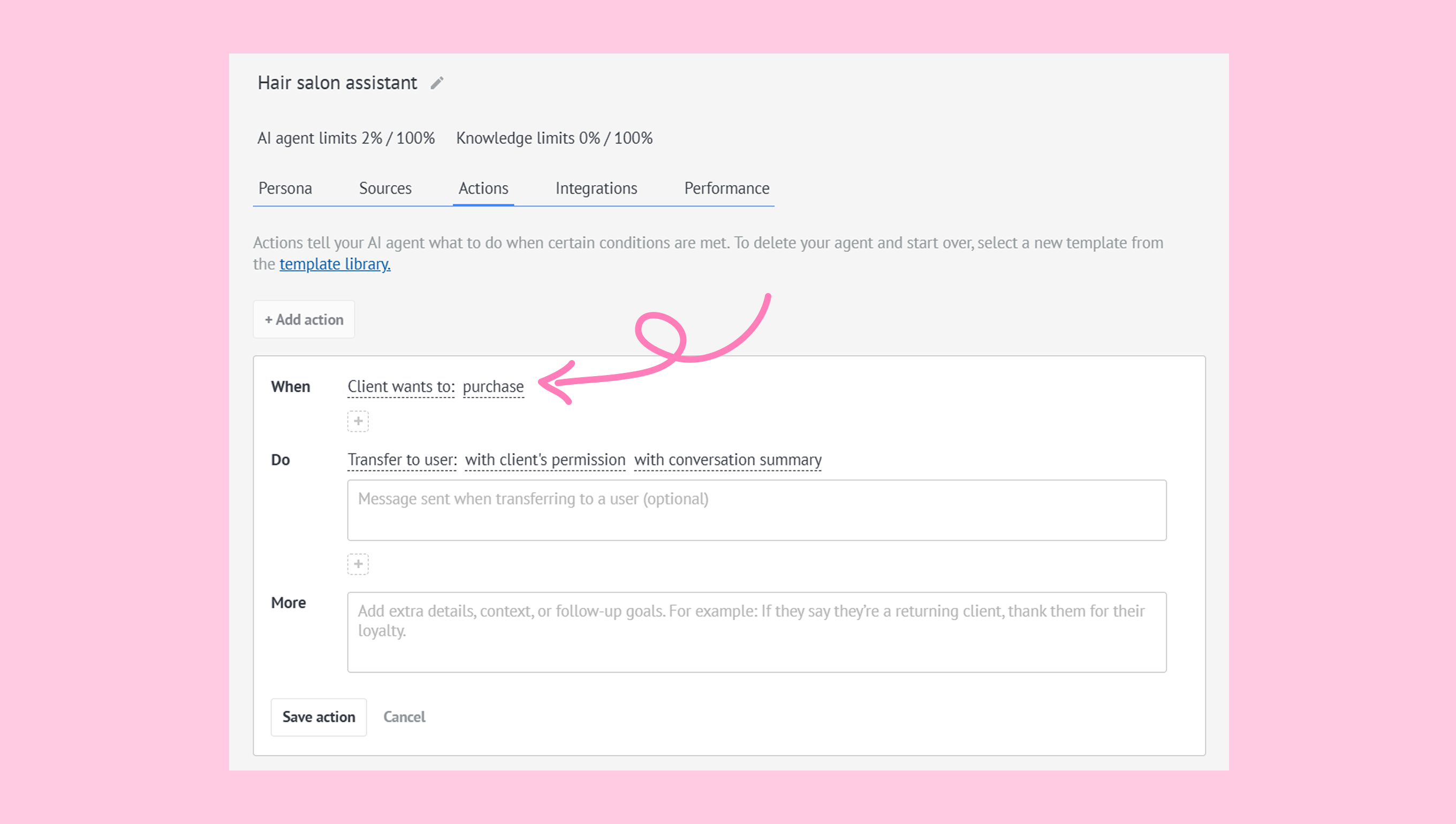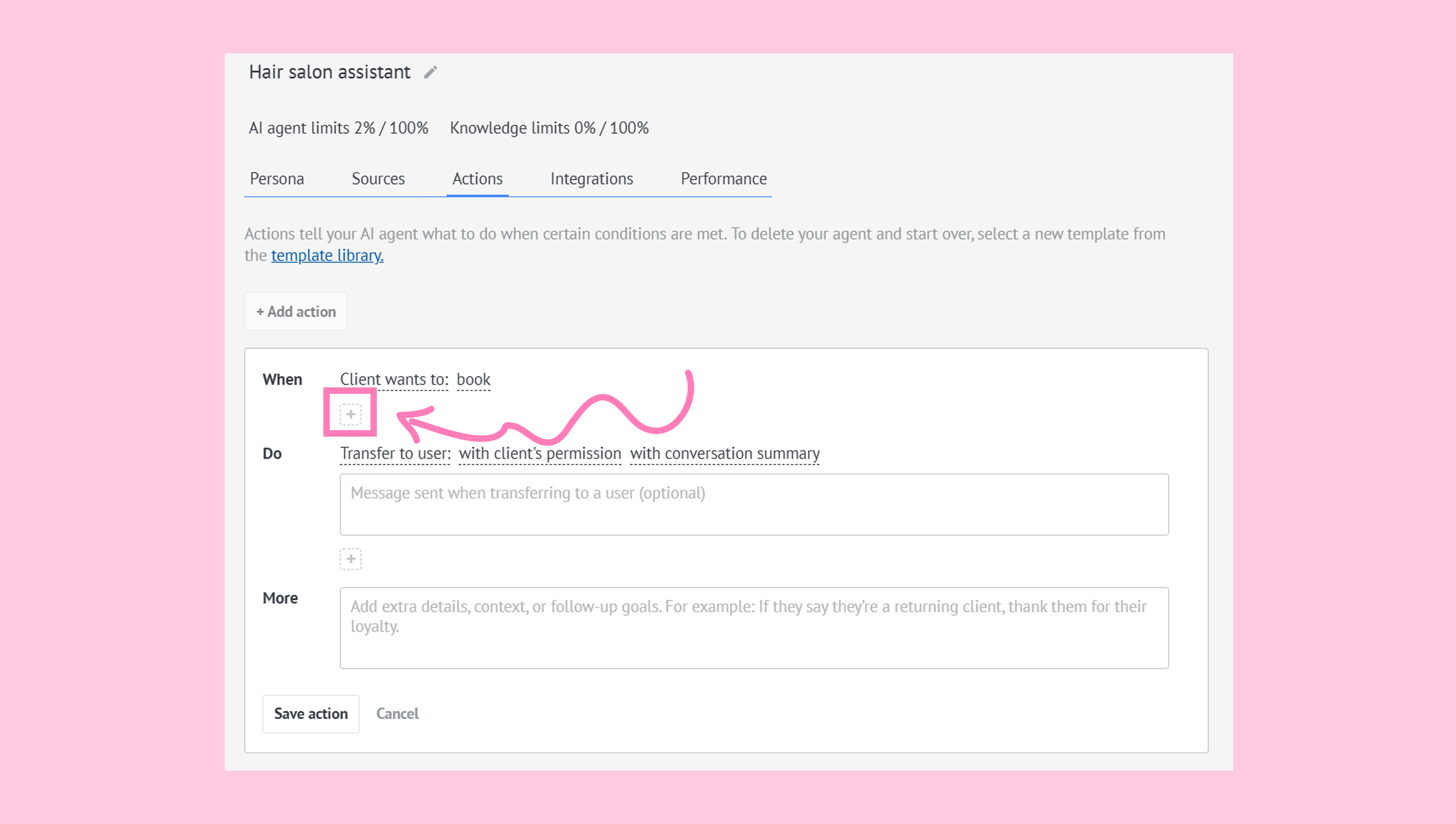 Go to AI Agent and open the Actions tab. Click + Add action.